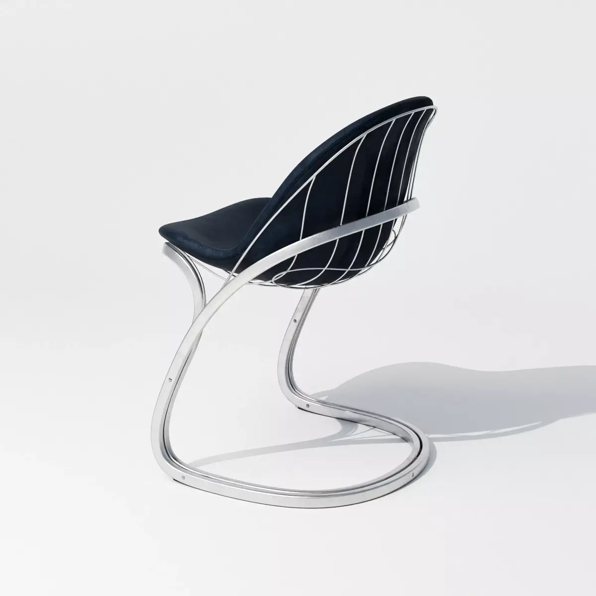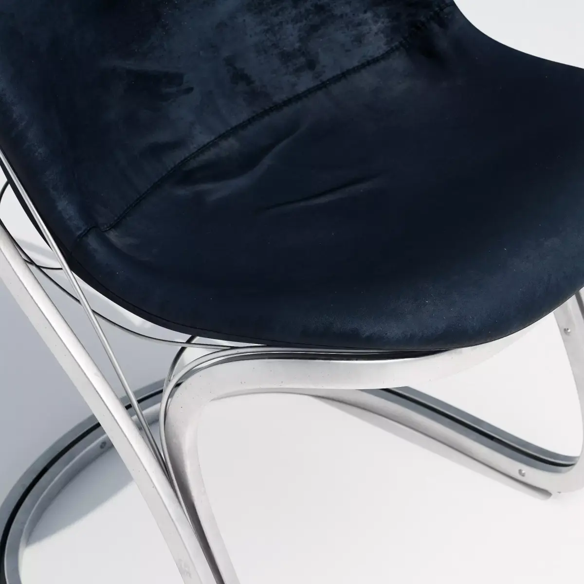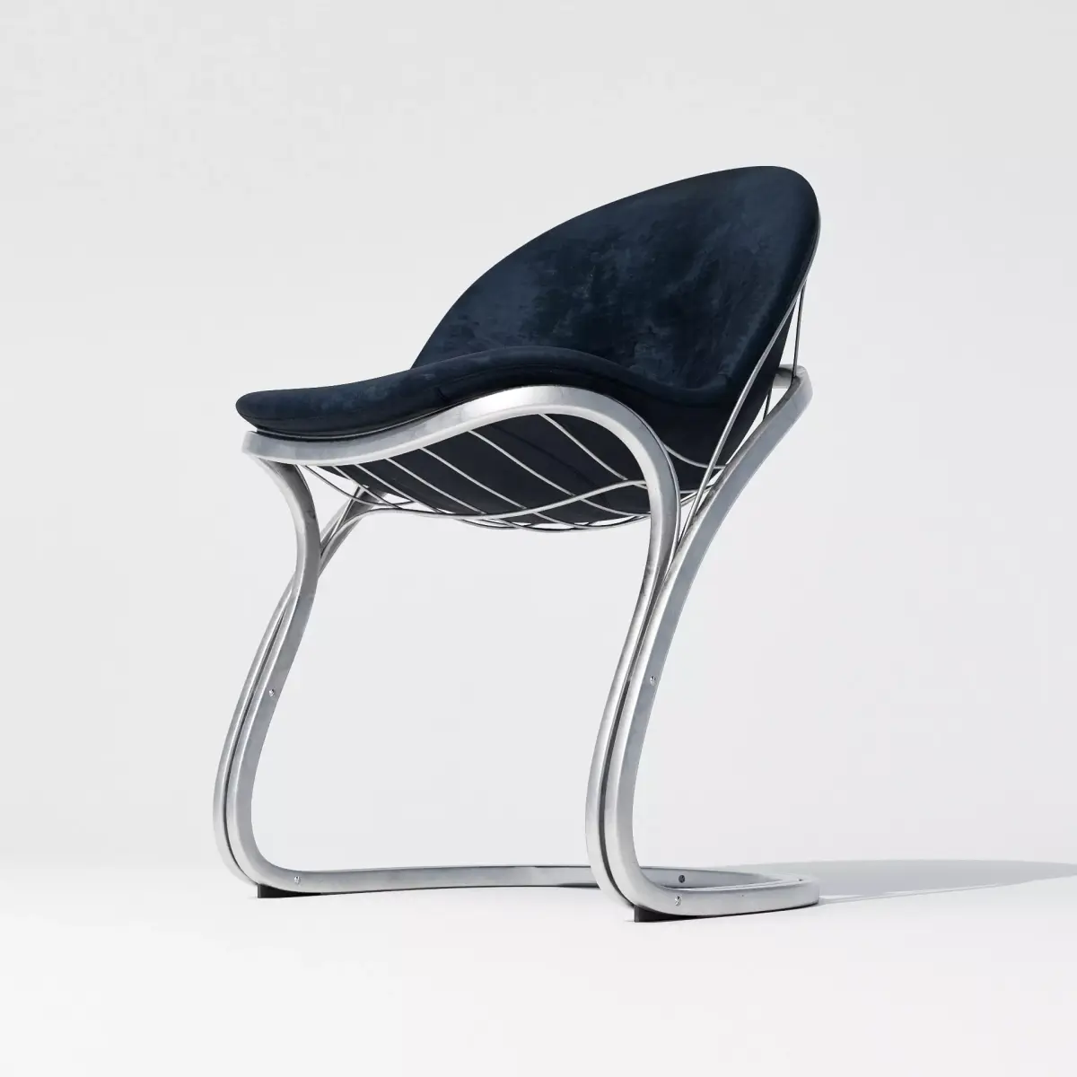 With its fluid silhouette and exposed structure, the curve frame chair channels a late-modernist fascination with movement, lightness, and form. The polished metal tubing wraps around a deep navy upholstered shell, combining softness with a sense of engineered precision. Equally suited to bold interiors or stylized set pieces, it brings sculptural tension and futuristic elegance to any visual narrative.
