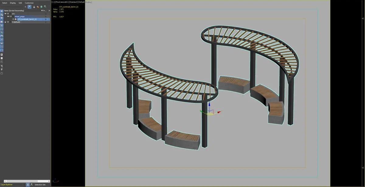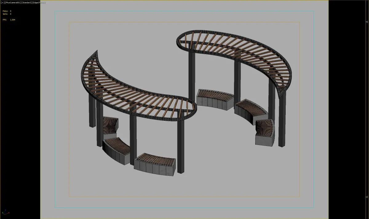 This modern curved seating area features a wooden canopy and concrete bases, perfect for urban landscapes and parks. Designed for comfort and style, it provides shade and aesthetic appeal.