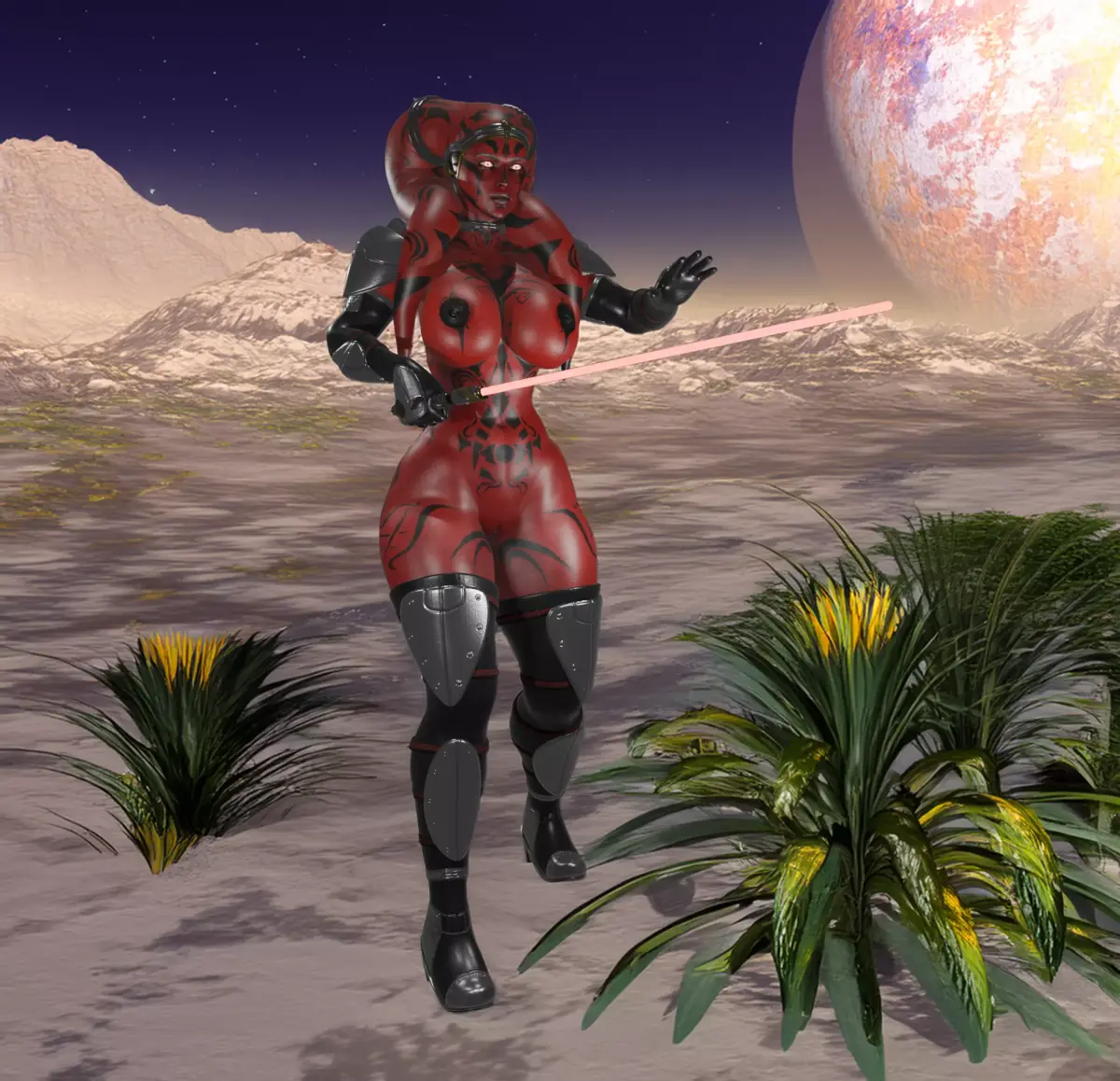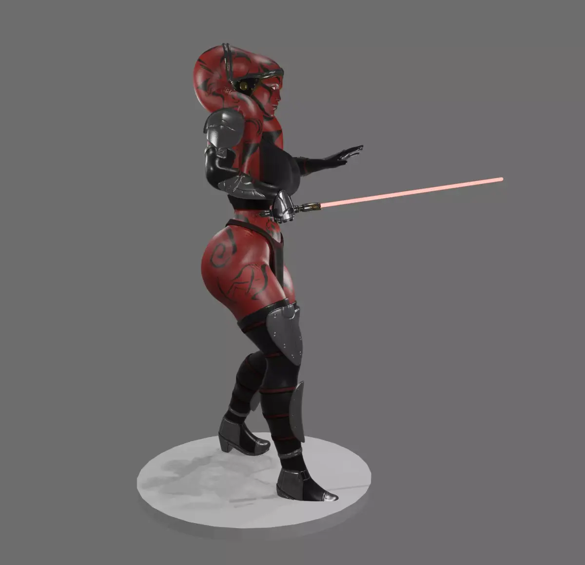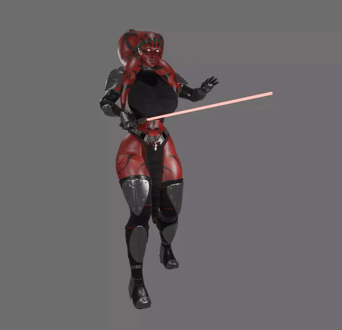 A curvy, red-skinned humanoid warrior stands in a dynamic combat stance, wielding a glowing red energy blade. Her skin is patterned with dark markings, and she wears black and metallic armored plates on her shoulders, arms, legs, and boots, blending organic form with futuristic battle gear. The character’s expression is intense and focused, with glowing eyes that emphasize a powerful, ominous presence. The overall design combines sci-fi and dark fantasy aesthetics, suggesting a formidable force-aligned fighter prepared for close-quarters combat.