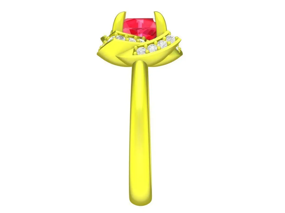 This 3D jewelry model presents a cushion-cut gemstone ring with a classic halo design. The center stone is securely set in prongs and surrounded by a pavé halo that enhances brilliance and visual depth.