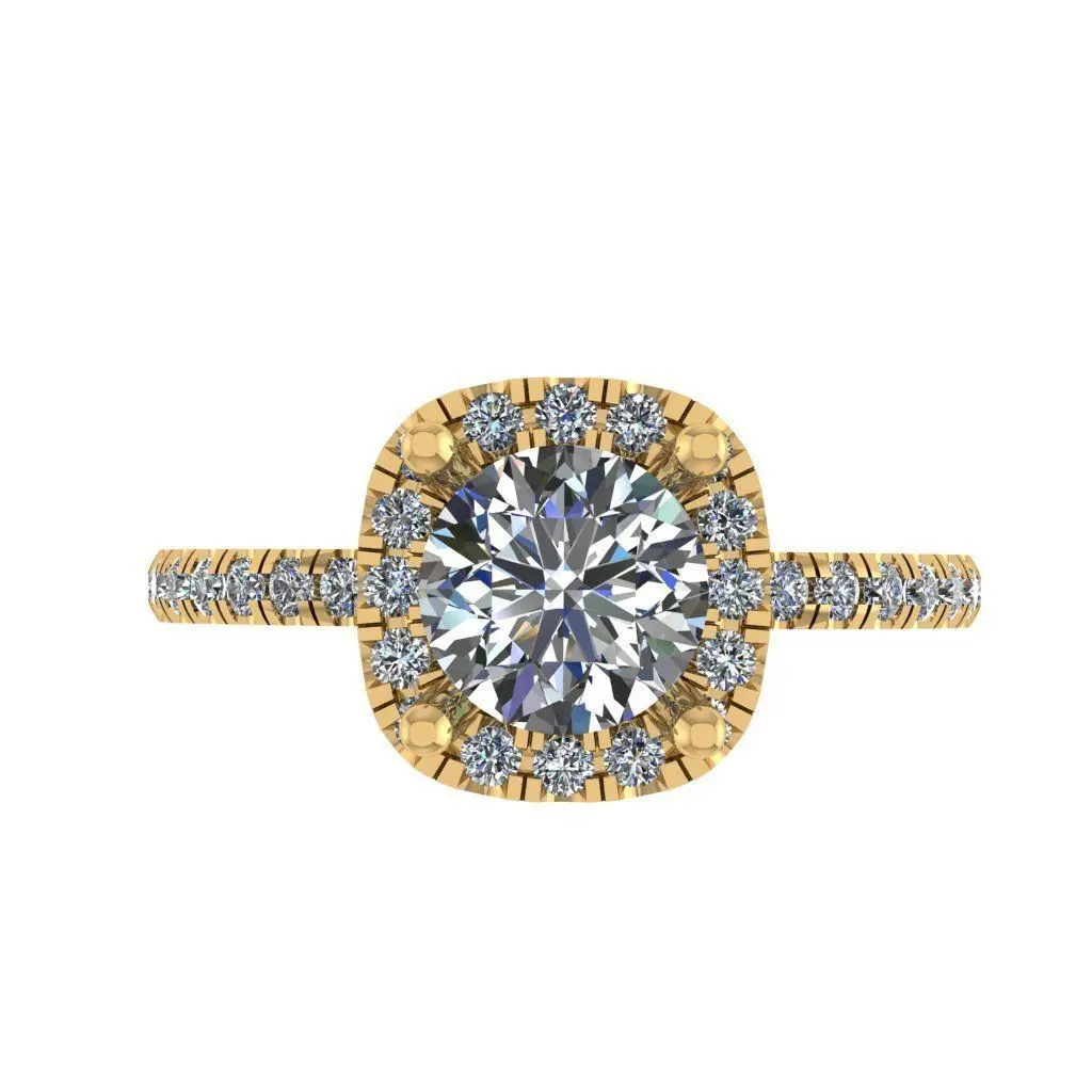 -Cushion shaped halo solitaire ring that holds a 0.75 ct round cut stone in the center, surrounded by 0.007 ct stones and finally 0.008 ct stones on each side on the shank