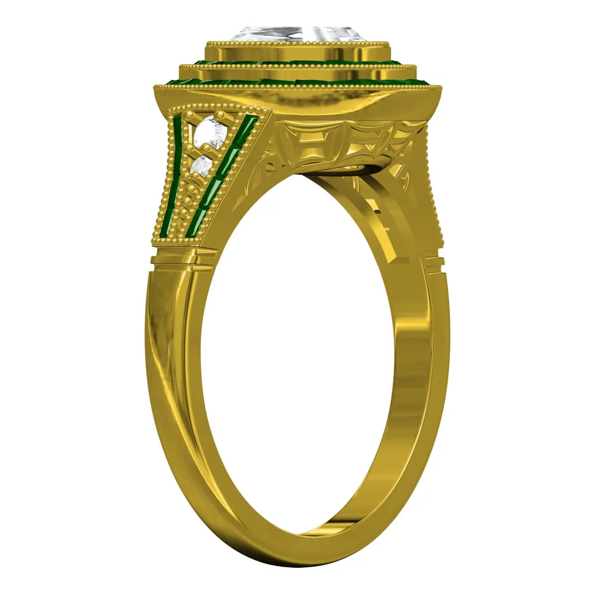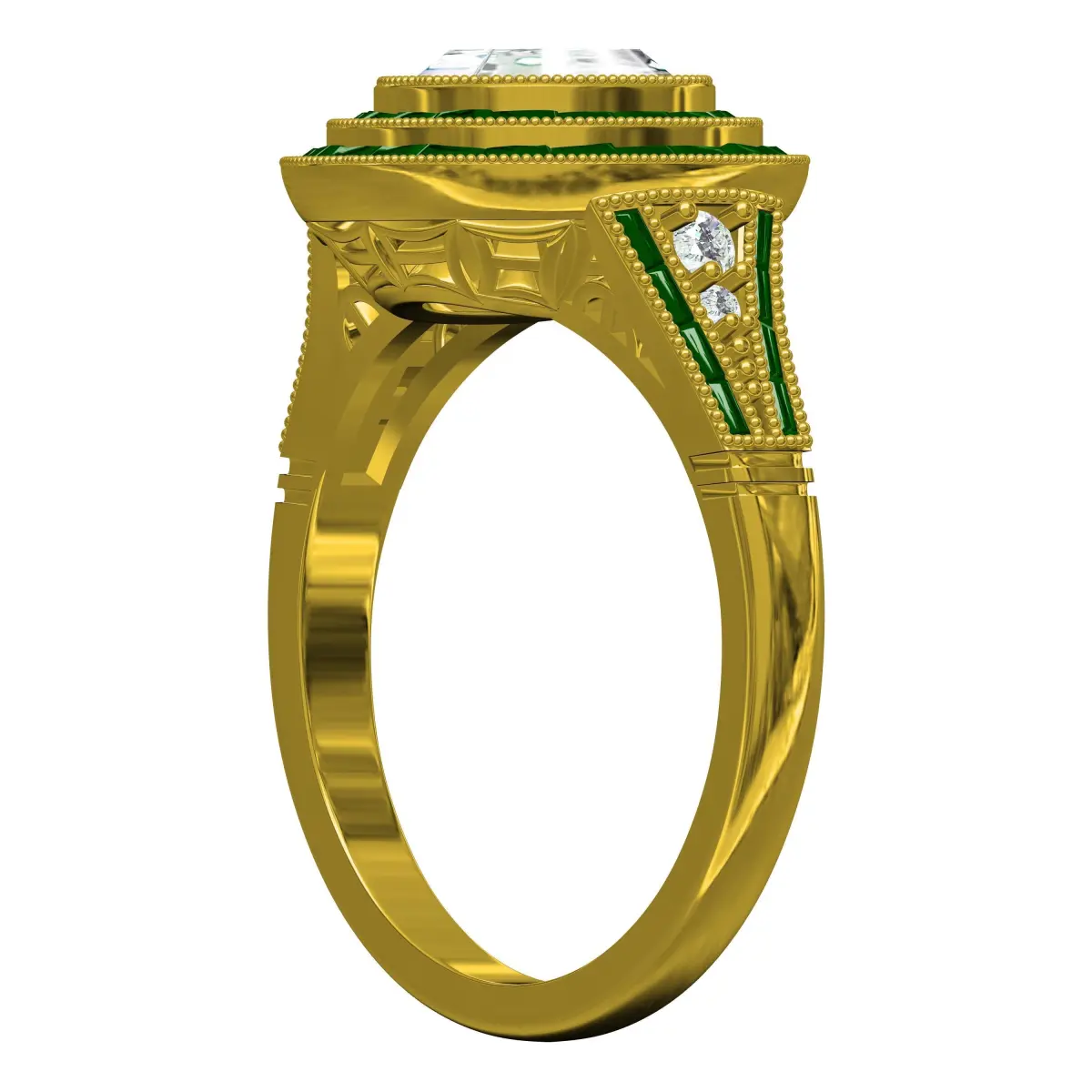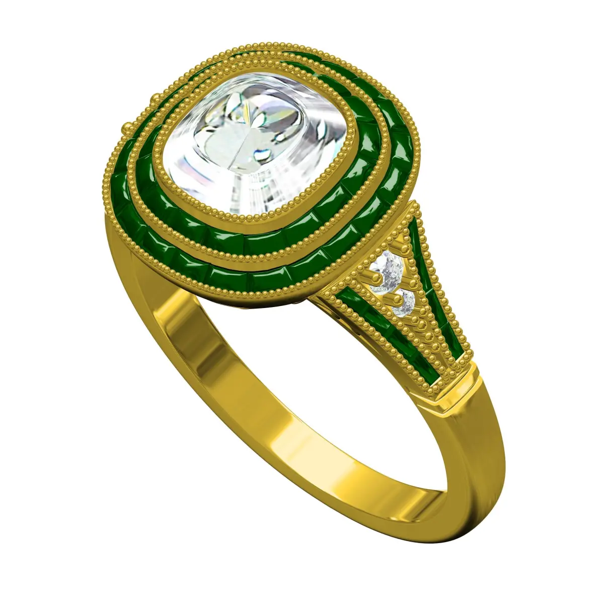 Cushion Stone Baguette Diamond Double Halo Art Deco Ring