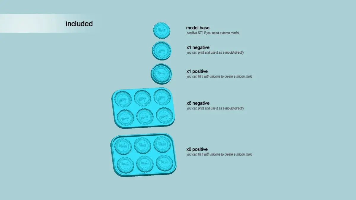 The base model is used for a example printing.The negative pieces can be used as molds itself.The positive pieces can be used to create silicon molds, by filling.