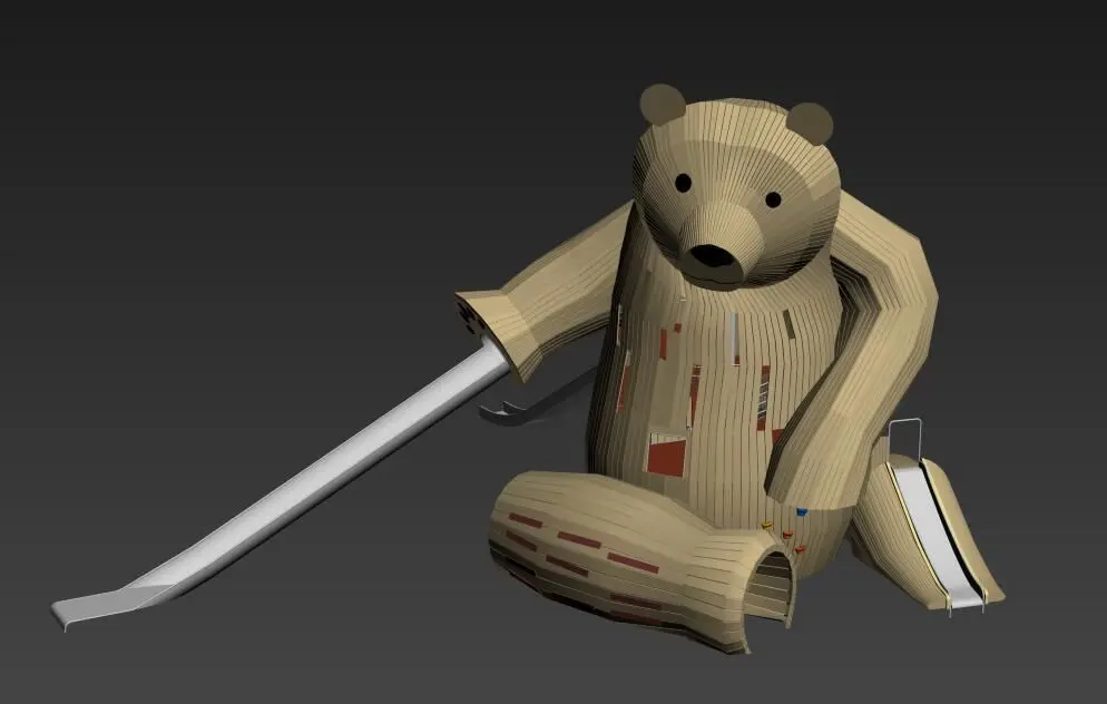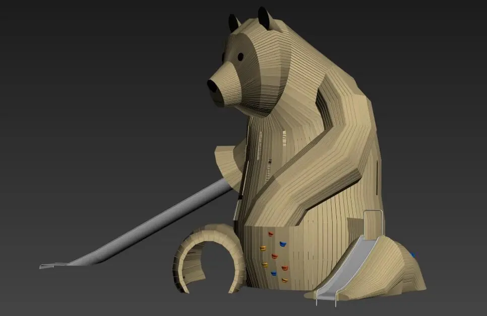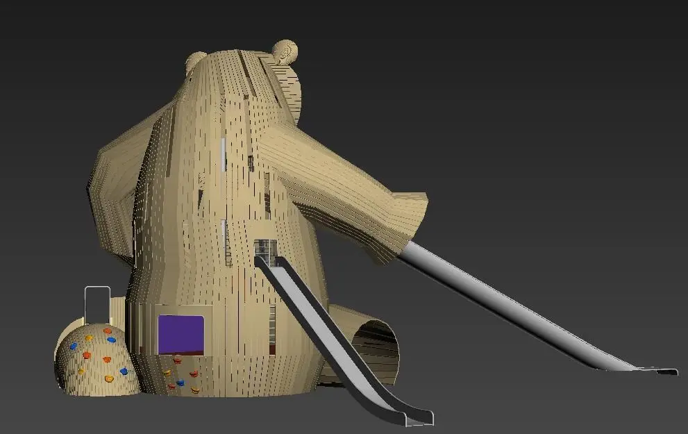 Custom Design Non-standard wooden Bear Theme Playground equipment.This is a large-scale comprehensive wood amusement equipment.Wooden play structure include drilling, climbing, swing, sliding and ect. Wood bear inner have four floor, total could take 15-25 kids play together.This playground equipment suggest site size is 15*15*7m.