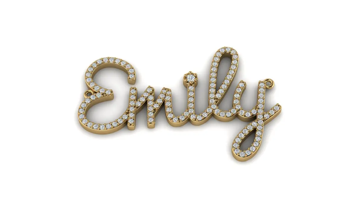 This jewel is a custom nameplate pendant, meticulously crafted to spell Emily in a flowing script font. It is designed to be fully adorned with diamonds.
