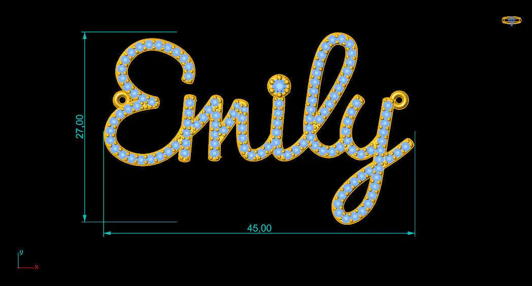 Design Elements:The pendant features the name Emily rendered in a stylized, cursive script. The entire surface of the lettering is pave-set with numerous round diamonds, creating a continuous, glittering effect. The variation in diamond sizes (primarily 1.20mm, with a few 1.00mm and one 2.00mm) suggests a deliberate placement to optimize coverage and sparkle across the curves and points of the lettering. The piece includes an integrated bail on each end of the name for suspension, designed as simple, small circular loops. The overall design intended for personalization and elegance.