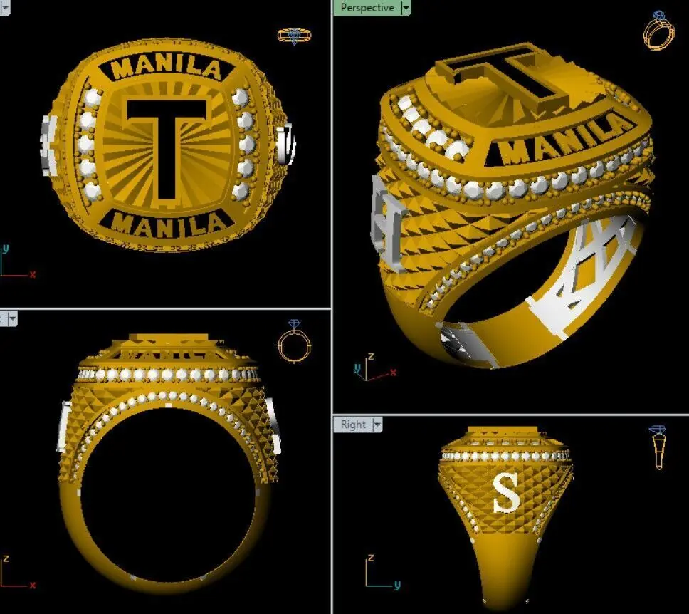 This high-detail custom championship ring 3D model features a bold T initial design and the word MANILA prominently engraved on the face and sides. The ring is set with pavé-style diamond accents and an elegant sunburst background on the top surface, giving it a luxurious and prestigious look.