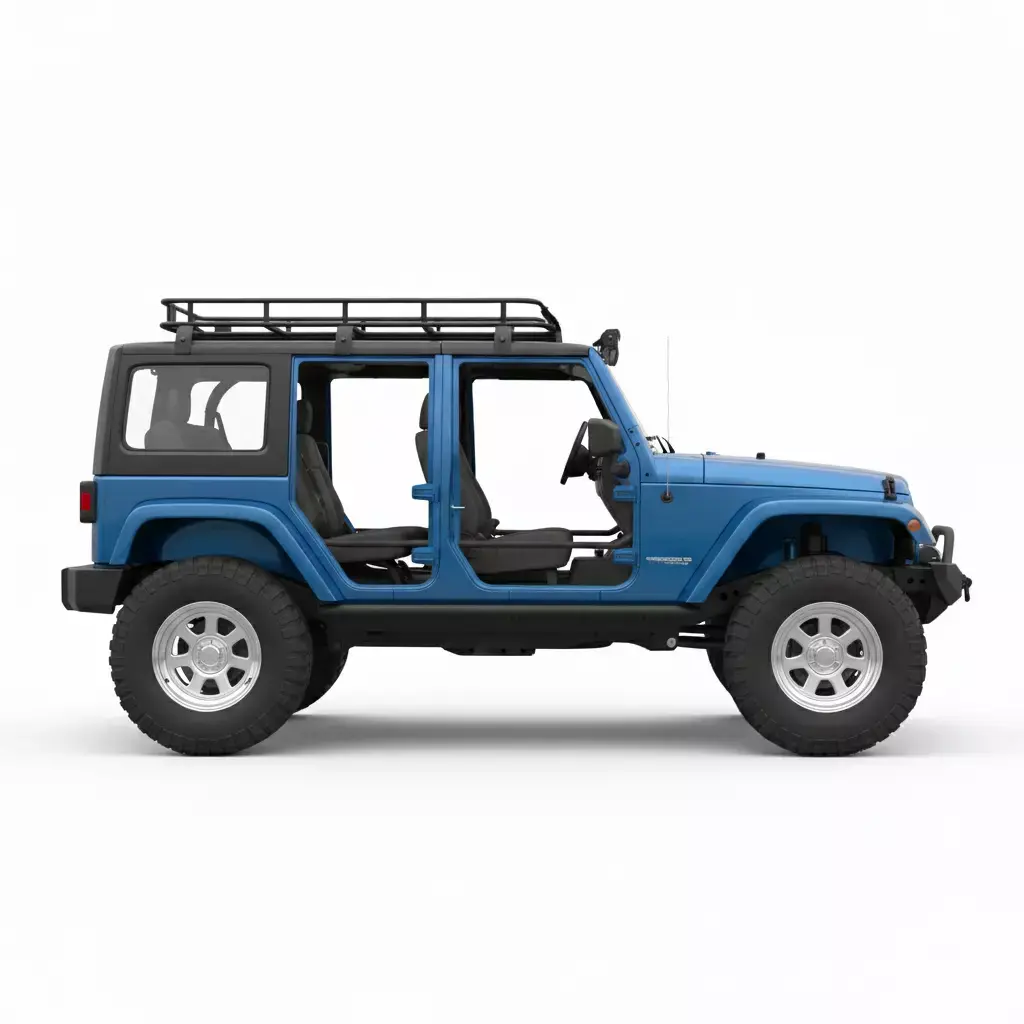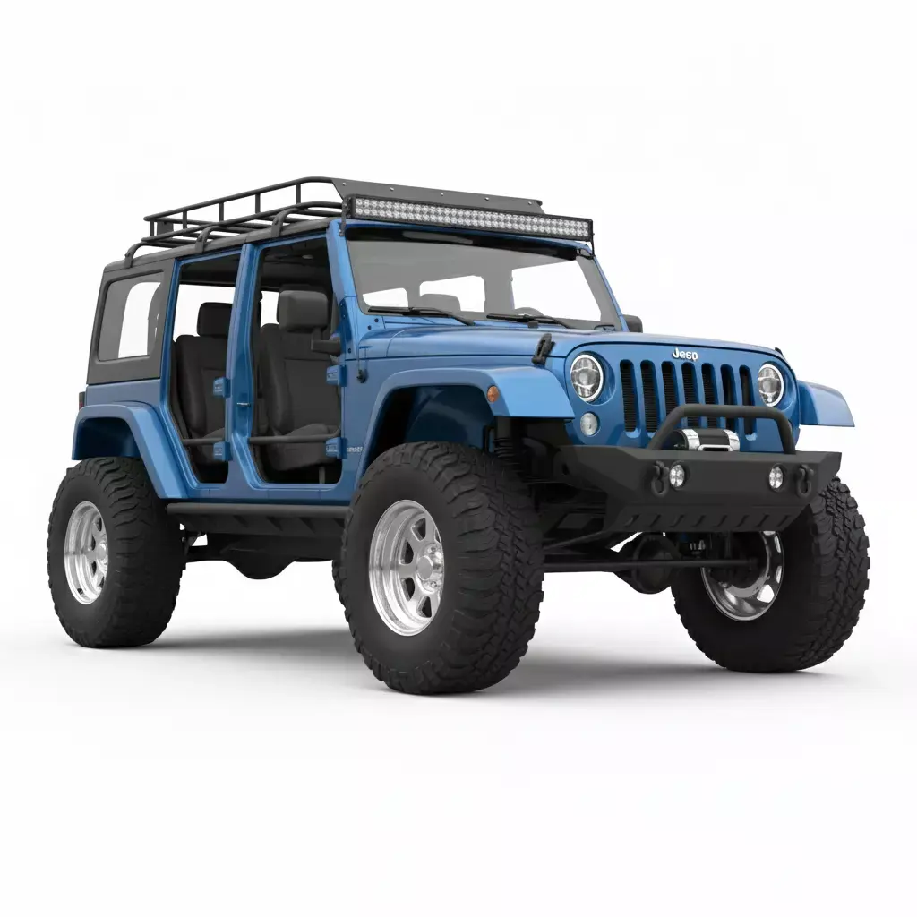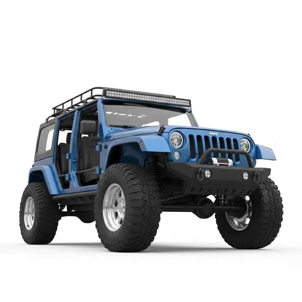 This is an aggressive, high-detail 3D render of a heavily modified, four-door Jeep Wrangler Unlimited. The body is finished in a vibrant electric blue, complemented by numerous off-road customizations. Key features include an extreme suspension lift, large knobby mud-terrain tires mounted on deep-dish chrome or aluminum wheels, and a heavy-duty front bumper equipped with a winch. It also has a functional roof rack supporting a long LED light bar mounted above the windshield. Rendered at a low, front-three-quarter perspective on a clean white background, this 3D model emphasizes its rugged capability and distinctive look, making it an excellent asset for game environments, adventure visualizations, or specialized automotive projects.