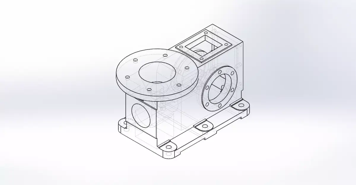 This is a 3D CAD model of a gearbox housing / machine casing, designed for industrial and mechanical applications. The component features: