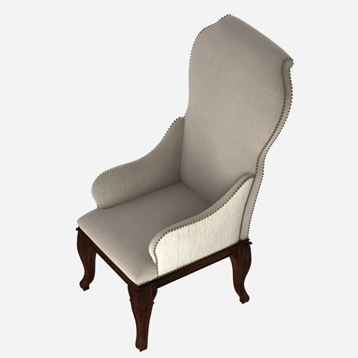 Custom made antique dining chair solid dark wood frame, legs, hand crafted, decoratedupholstered in beige textile, seat, back, arms, nailhead decorated.Curved arm, back, legs