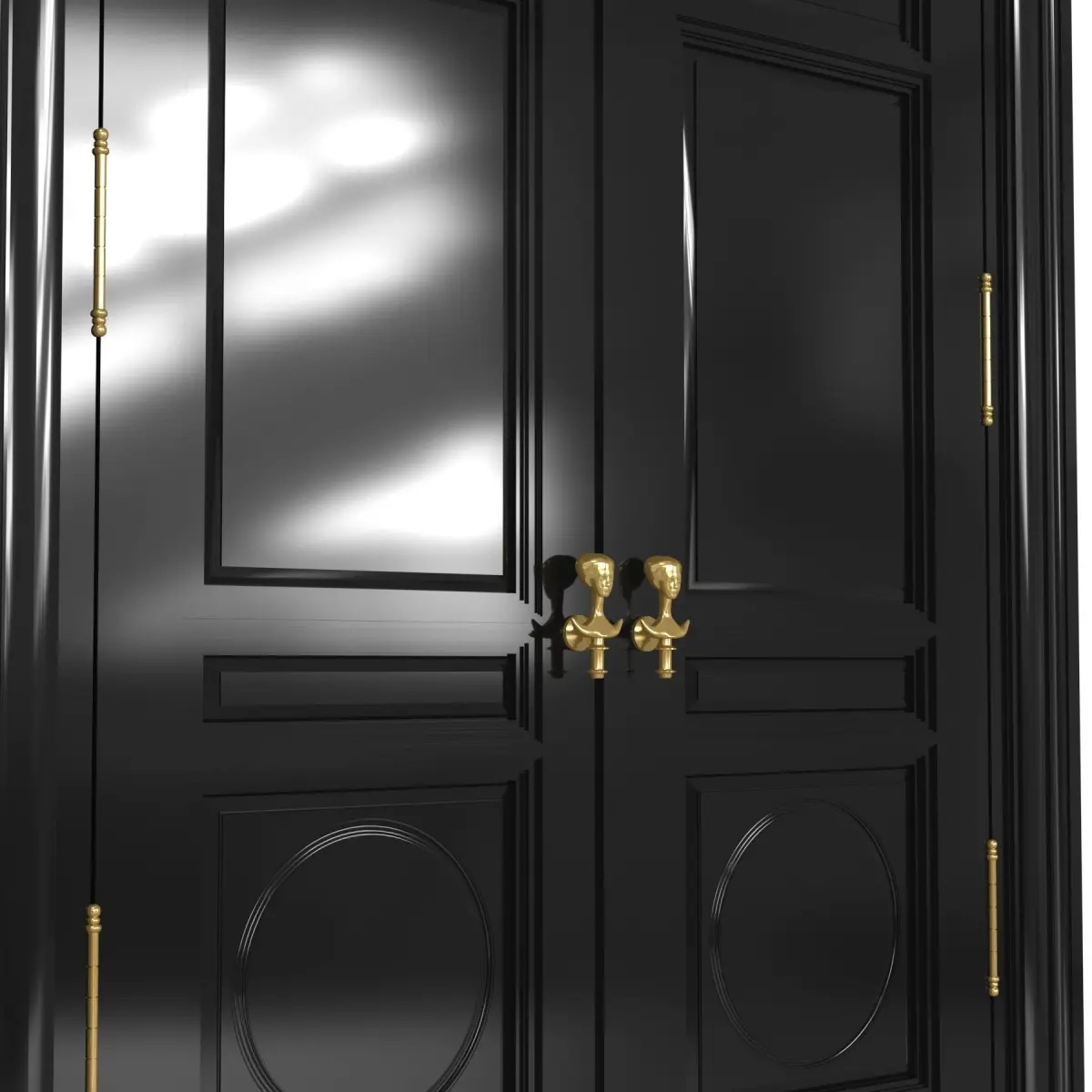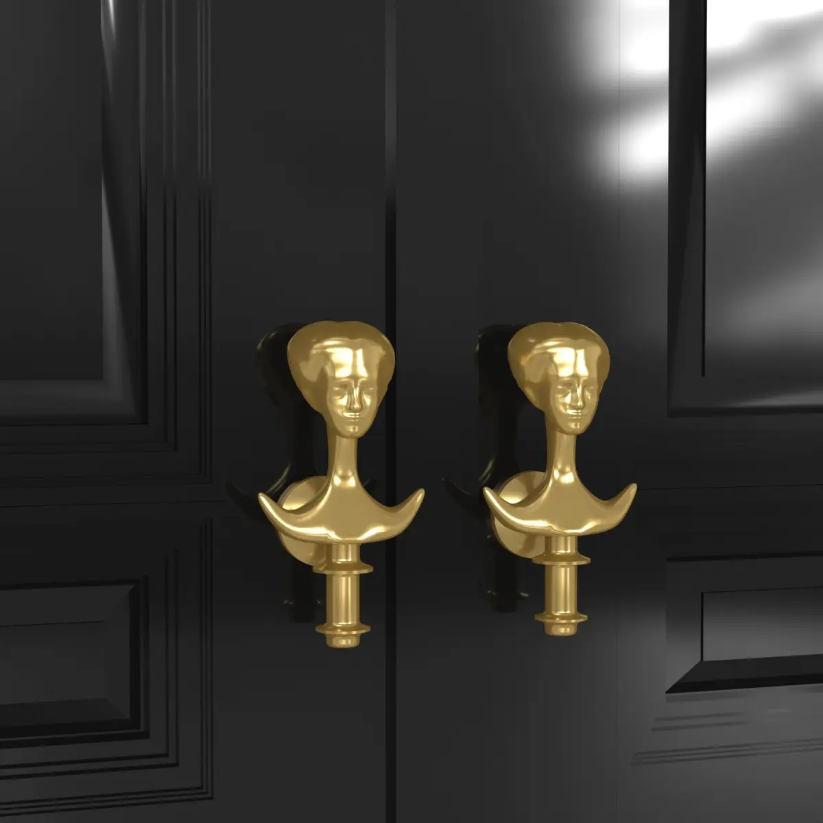 black finish paint, brass hinges, pull handle woman head abstractround circle in center decor