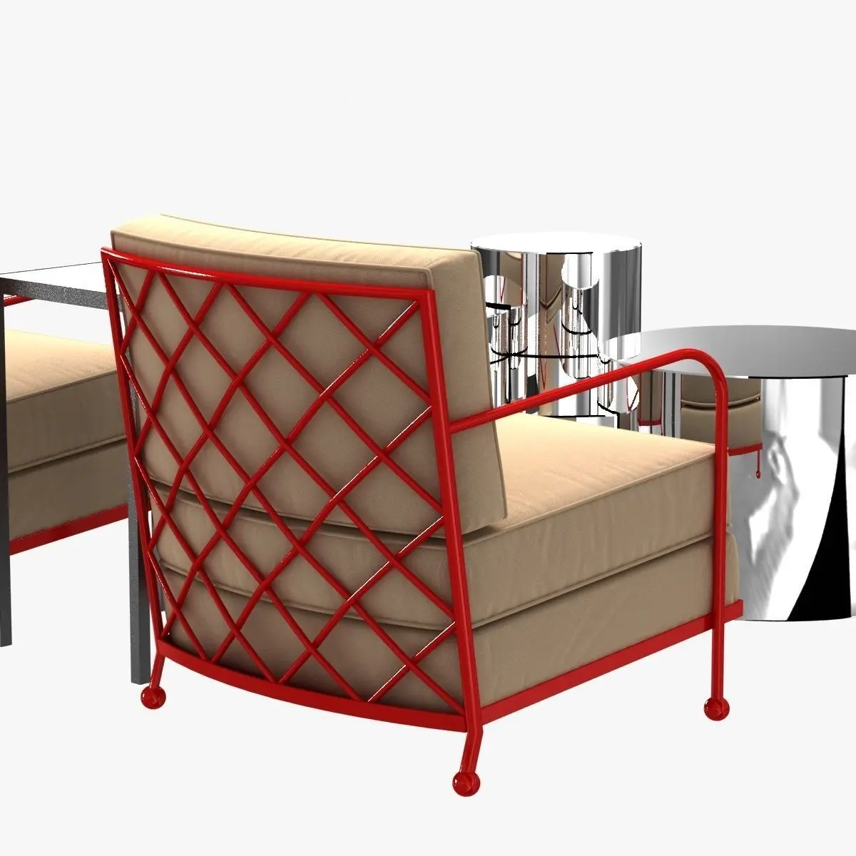 custom made club chairsmetal frame made from tubes painted in glossy red paint seat and back cushions upholstered in beige textile