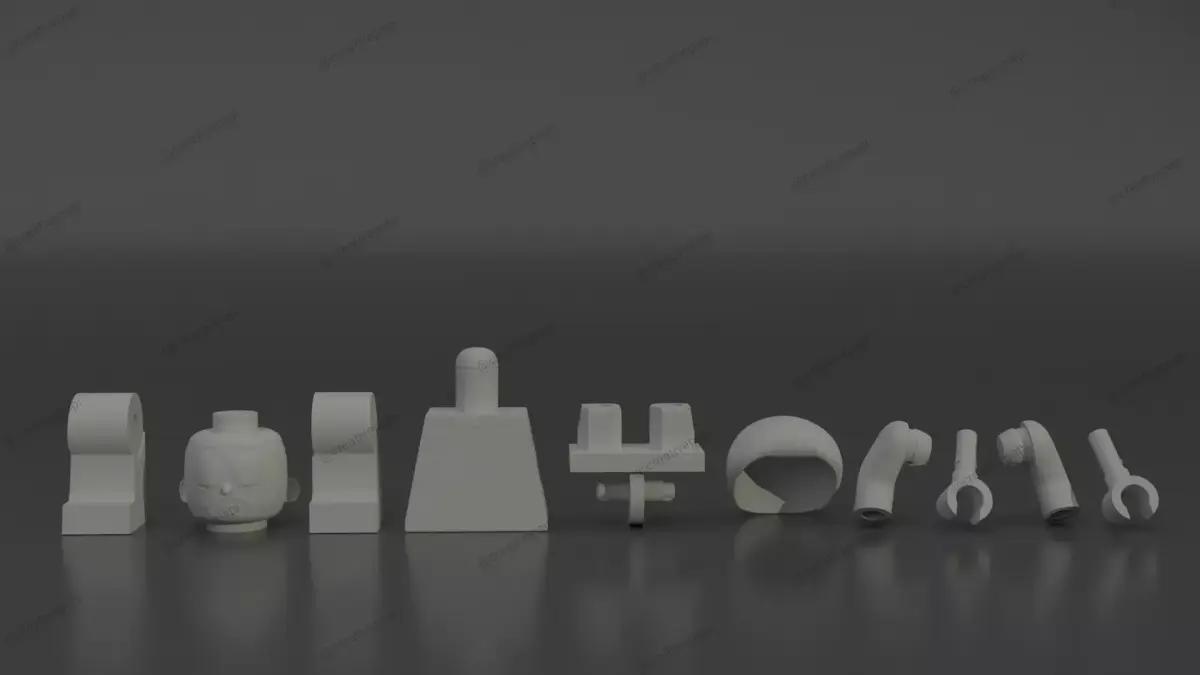 Separate pieces:-Head,Hair,Torso,Waist,Left and Right Arms,Left and Right Legs,Left and Right Hands.