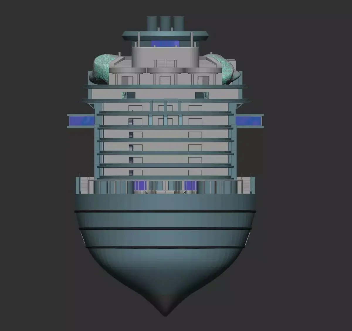 Insides fully modelled, i am new to the bigger peices so if you think it needs something added or removed such as (the sculture in middle of ship may be hard to print) some people may want windows removed to add intirior scences, some people may want a cross sectioned view to easily add peices, or you find an error, please let me know through messages or comments what you think would be of benifit to you and im happy to try make it happen. As far as i am aware no ship model currently available features a fully modelled intirior so i am very happy to bring this project to the modelling community (: