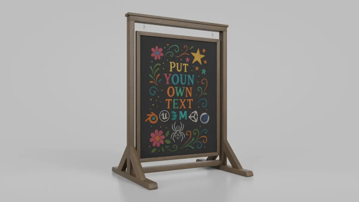 • Customizable Chalkboard Surface: Ideal for adding your own text, graphics, or advertisements.• High-Quality Textures: Handcrafted wooden and steel frames with realistic details for a natural, authentic look.• Clean Topology & Real-World Scale — Quad-based topology ensures smooth surfaces for high-quality renders and animations.• Optimized for Real-Time Use — Game-ready, suitable for offline and real-time engines such as Unity, Unreal Engine, and other game engines.• Fully Organized Hierarchy — Easy to use, with proper pivot points and clear object structure.