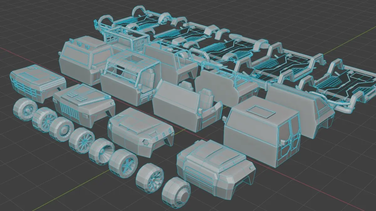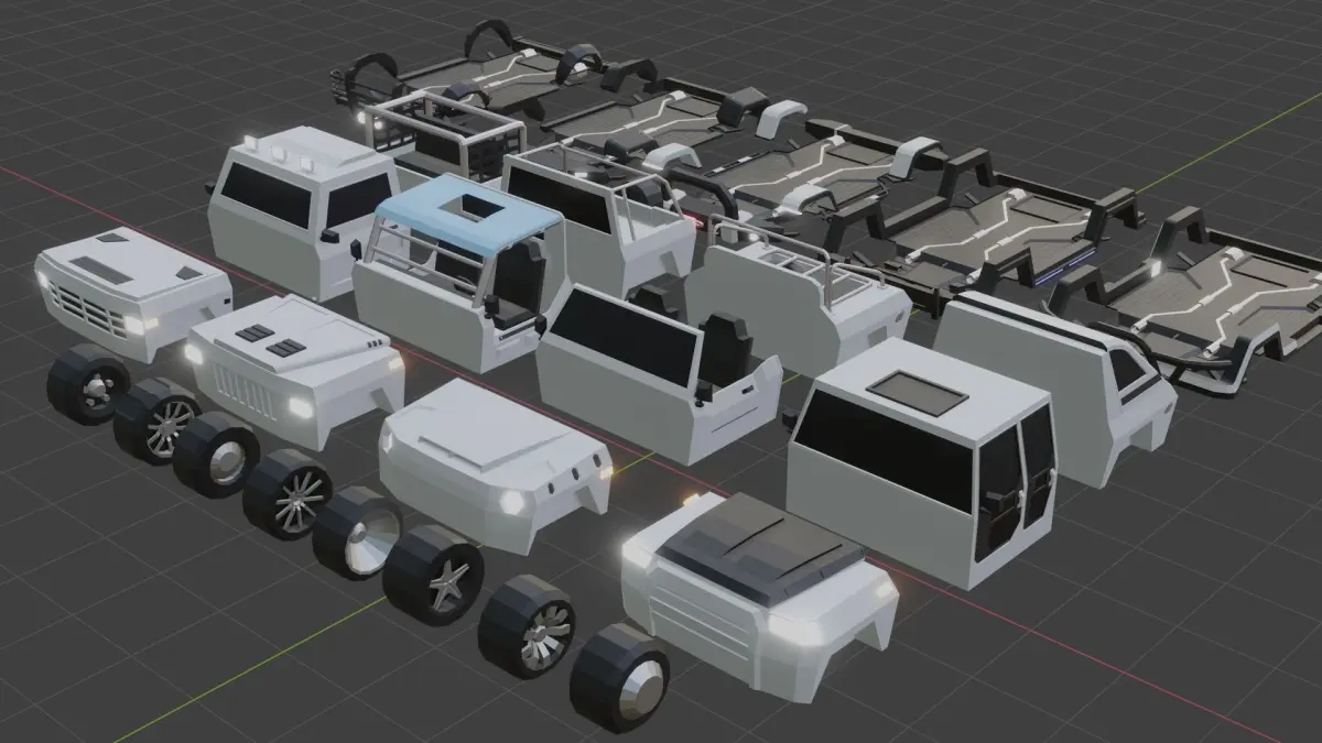 what you will get : 1- blender file with 17 part (4 front 4 mid 4 back and 5 bases) all part work together and 8 different wheels please watch the demo to see how they work