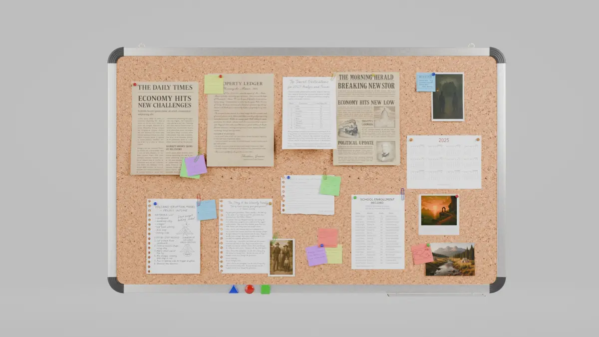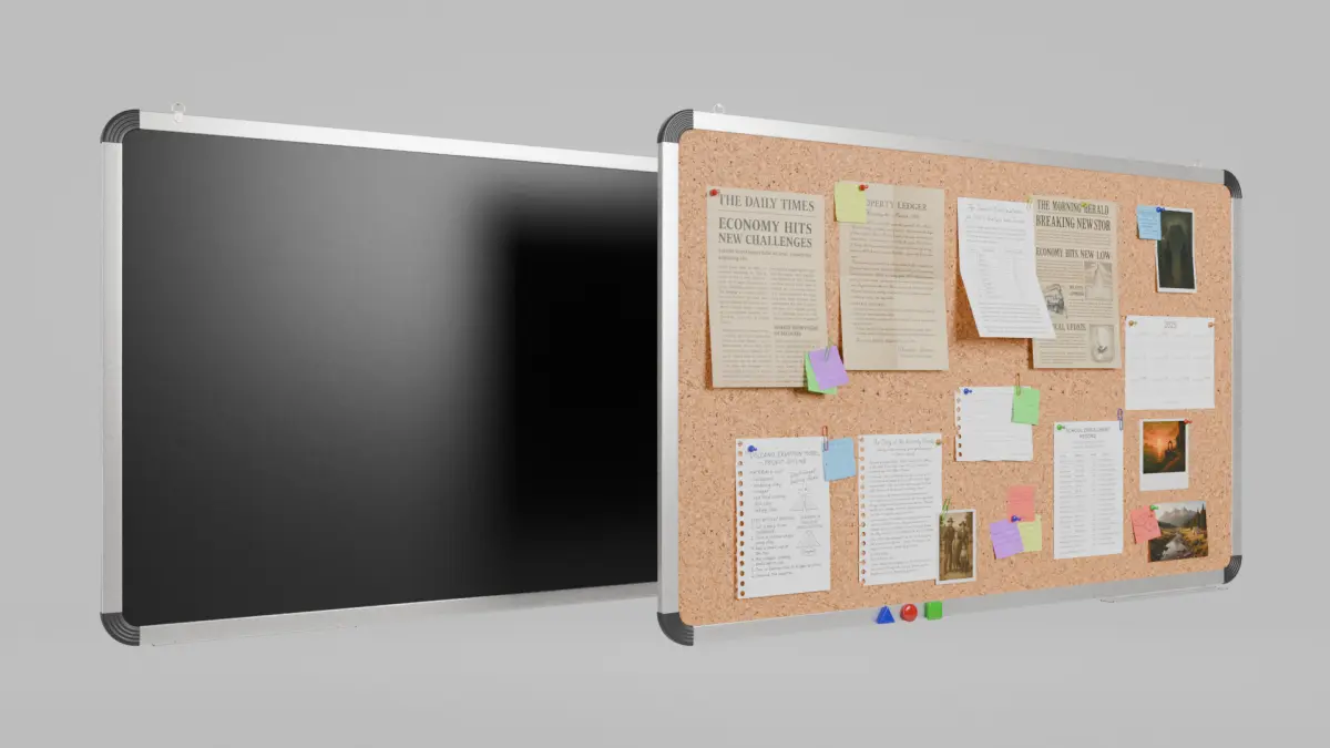 A high-quality asset featuring a fully customizable wall-mounted corkboard, complete with pre-assembled office accessories. Ideal for office scenes, classrooms, architectural visualization, and game environments.