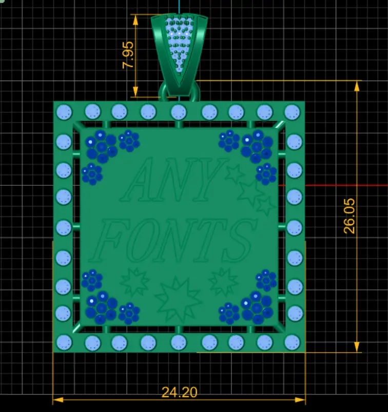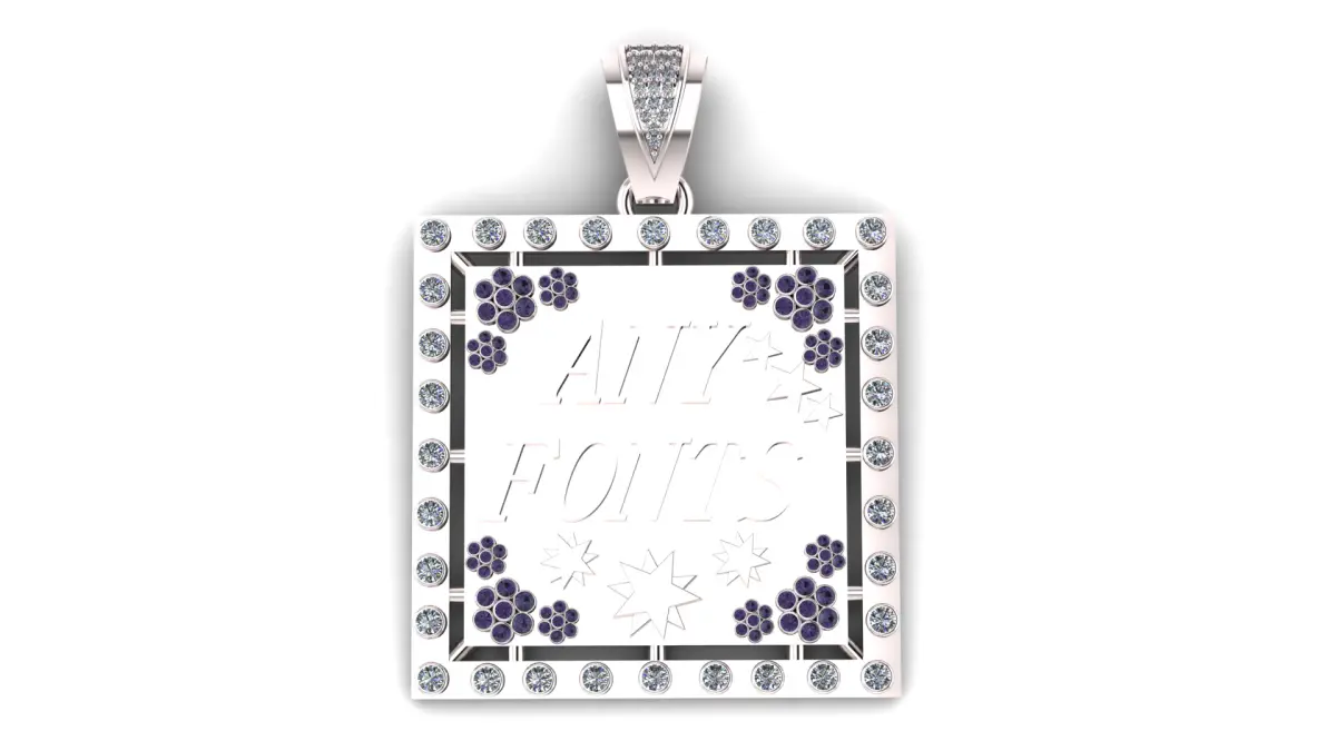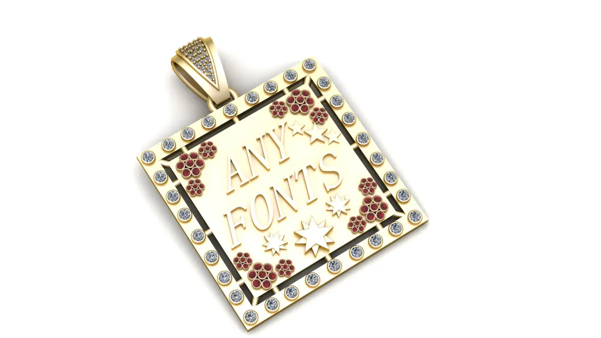 This striking square-shaped pendant offers a fully customizable text option (ANY FONTS) allowing for any desired name, word, or phrase to be beautifully engraved in your preferred font style. Framed with a luxurious border of sparkling diamonds, each side is highlighted with clusters of ruby-like floral accents and decorative star motifs, adding a playful yet elegant touch. The diamond-studded bail enhances the brilliance, making this pendant a perfect blend of personalization, artistry, and timeless luxury — ideal for gifts, personal keepsakes, or fashion statements.