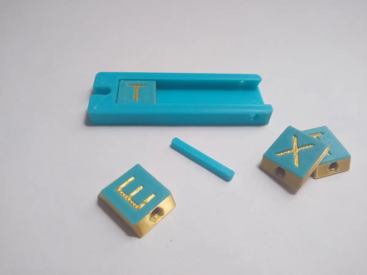 This is a 100% customizable tag. This tag can be configured into any message, that is between 1 and 10 characters long. This file only includes the English capital alphabet, as well as a space, but for more compatible characters, you can visit the Dovetail Tile System collection. The different letter tiles give the tag a scrabble feel, as well as making the tag completely customizable. This tag can also be changed to different text later due to the removable pin that keeps the letters in. Although, depending on the tolerance of your printer, you may need to use an Allen key or something of that sort to get the pin out.
