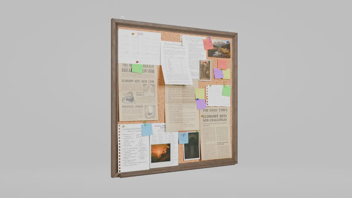 A high-quality asset featuring a fully customizable wall-mounted corkboard, complete with pre-assembled office accessories. Ideal for office scenes, classrooms, architectural visualization, and game environments.