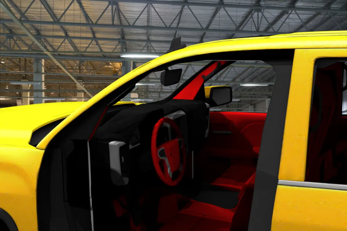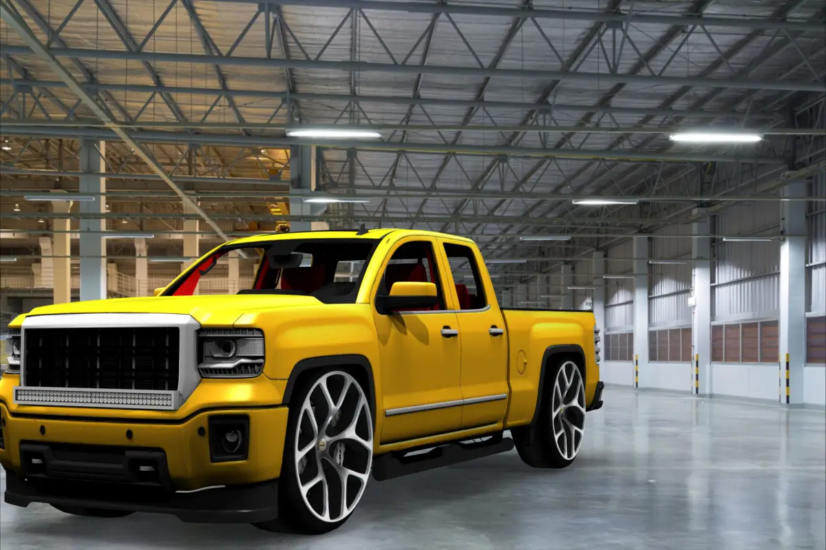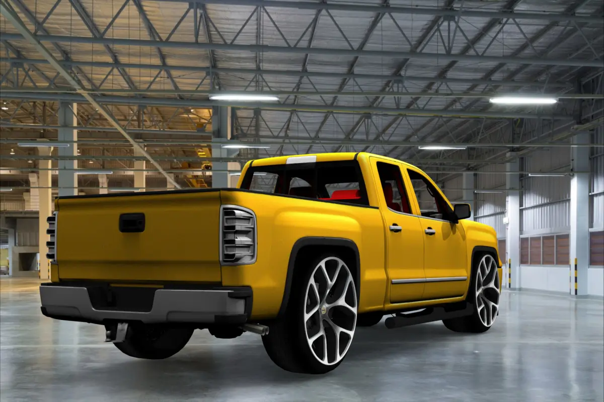 GMC SierraBright yellow paint jobAftermarket large rims with a unique twisted spoke designLowered suspension for a sportier stanceCustom front grille — blacked-out with a white frame and an integrated LED light bar underneathSmoked headlights for a more aggressive lookBlack accents on mirrors, bumpers, and trim areas.