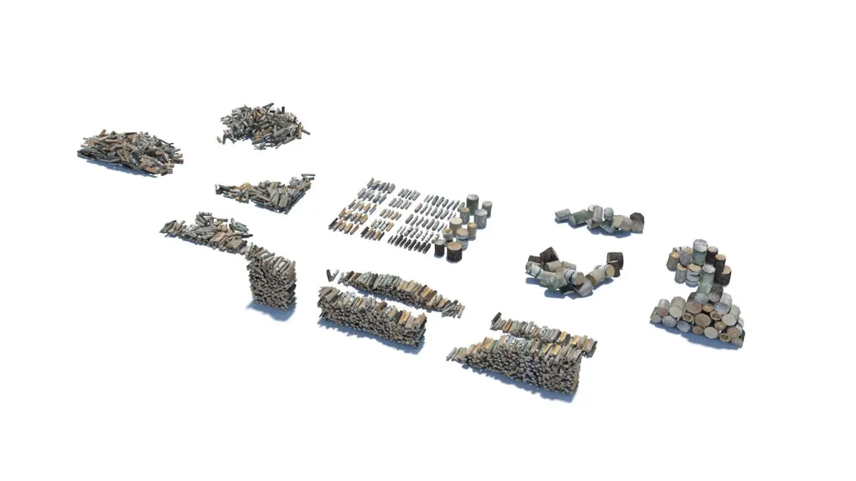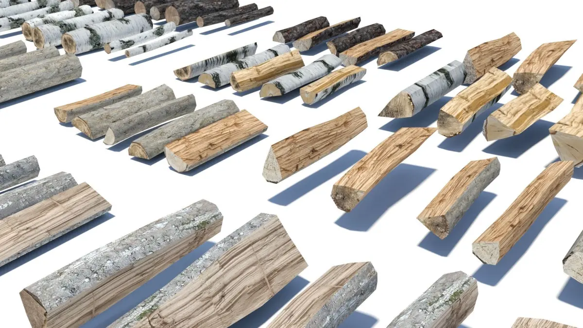 Low-poly pack of fire wood from five European tree species (pine, birch, maple, lime or linden and beech) in different states of processing. Some logs are just cut into smaller bits. Others are chopped already. Some of them are thrown on a pile carelessly during the process of chopping. Others are already neatly stacked. Some stacks are nearly depleted or in the middle of being re-filled for winter. Single pieces are about 30 - 40 cm long.