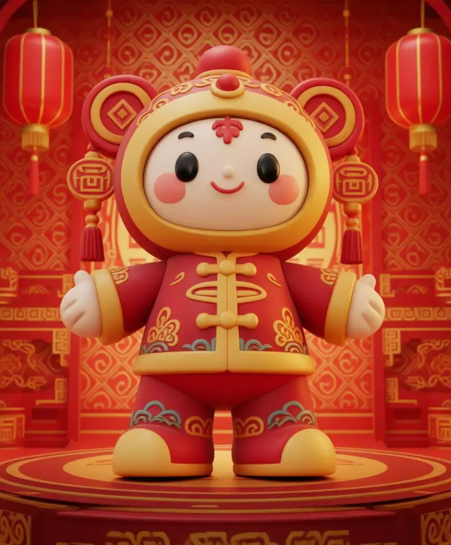 This is an irresistibly adorable and high-quality 3D model of a charming, cartoon-style character celebrating the Chinese New Year. Rendered in a vibrant, stylized aesthetic with smooth, rounded forms and a playful, toy-like quality, this character is perfect for bringing festive joy to any project. Its cheerful expression, bright colors, and traditional attire make it ideal for use in children’s media, mobile applications, social media campaigns, animated shorts, greeting cards, and website banners. The model is meticulously crafted with attention to detail and set against a richly decorated, festive background, making it a visually stunning asset for any creative professional seeking to evoke the spirit of the Spring Festival.