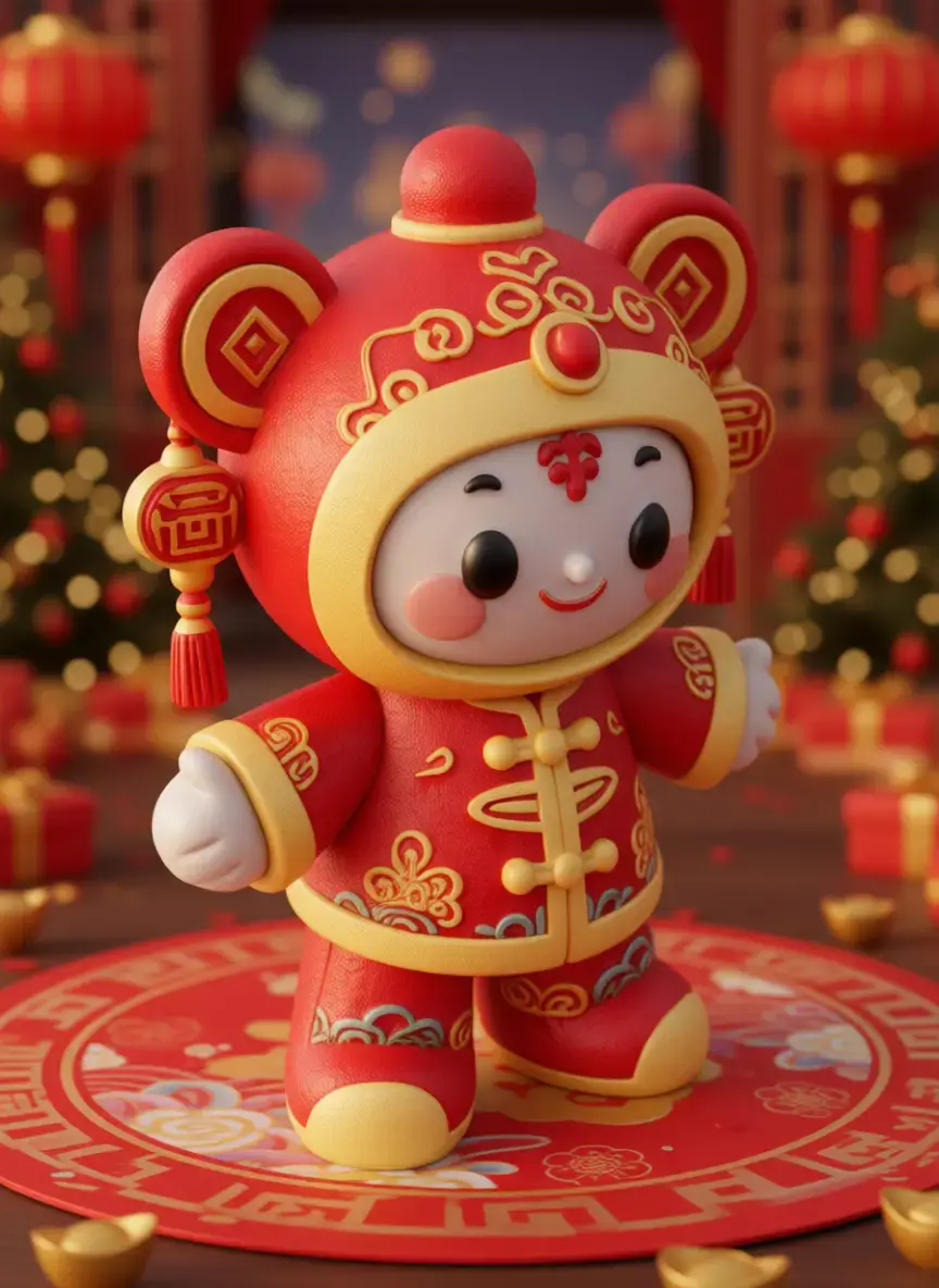 The character is designed with a large, round head and a plump, compact body, giving it a cuddly and endearing appearance. Its face is simple yet expressive, featuring large, glossy black eyes, rosy pink cheeks, and a sweet, smiling mouth. A small, red “fu” (福) character, meaning “fortune,” is painted on its forehead, adding a touch of cultural authenticity and good luck. The character is dressed in a brilliant red outfit, the quintessential color for luck and happiness during the Chinese New Year. The jacket features traditional frog-button closures and is adorned with intricate, swirling gold patterns along the collar, cuffs, and hem. The pants match the jacket, completing the coordinated look. Its hands and feet are white, providing a clean contrast to the vibrant red.