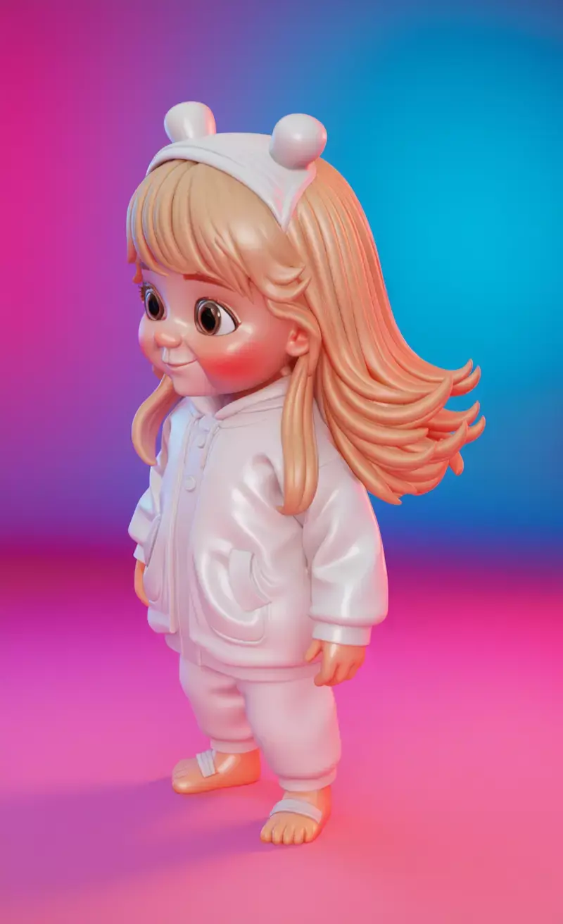 Download the charming 3D model of a cute cartoon girl, a digital recreation of a sweet, stylized character designed to capture hearts and imaginations. This cartoon girl 3D model features a plump, rounded body covered in smooth, matte skin — giving it a soft, huggable appearance. Her face is adorned with oversized, expressive brown eyes framed by delicate lashes, a tiny pink nose, and a gentle, closed-mouth smile that radiates innocence and charm. Her hair is styled in long, flowing waves with a warm, golden hue — adding depth and movement to her silhouette. The character’s most striking feature is her white hoodie — detailed with buttons, pockets, and a hood topped with small, rounded bunny ears — adding a touch of sweetness and playfulness. Her short limbs end in simple, pudgy hands and feet — enhancing its cartoonish, child-friendly aesthetic.