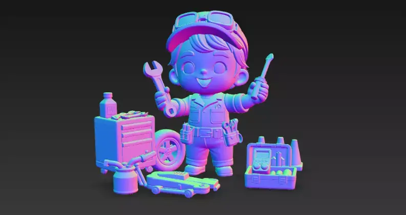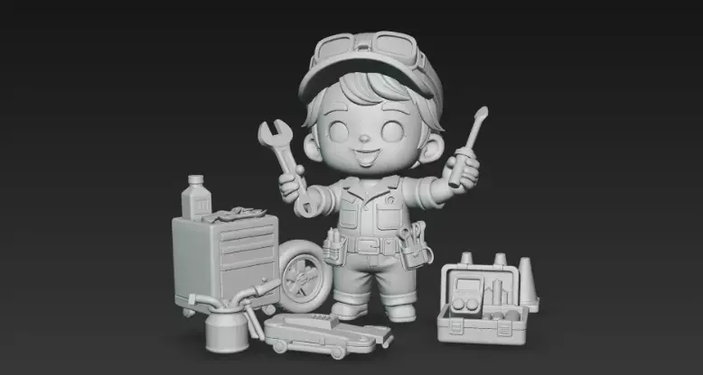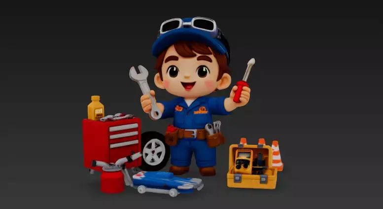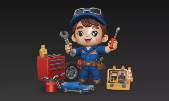 Cute stylized kid mechanic character ready for use in games, animation, and illustrations.He’s wearing a blue garage uniform with cap and goggles, surrounded by detailed workshop props like a tool chest, jack, toolbox, cones and oil can – perfect for car service or repair-shop scenes.