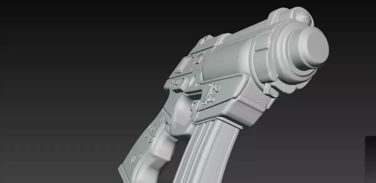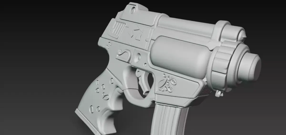 A brightly colored, plastic toy blaster, possibly designed for 3D printing, featuring a pink, purple, blue, and yellow futuristic design. The handle has a glittery texture, and the overall aesthetic is playful and reminiscent of space-themed children's toys or retro sci-fi props. It is photographed against a simple, pale pink background.