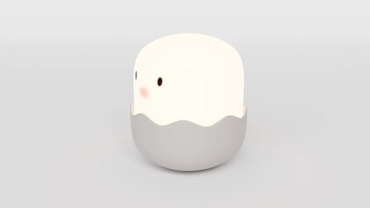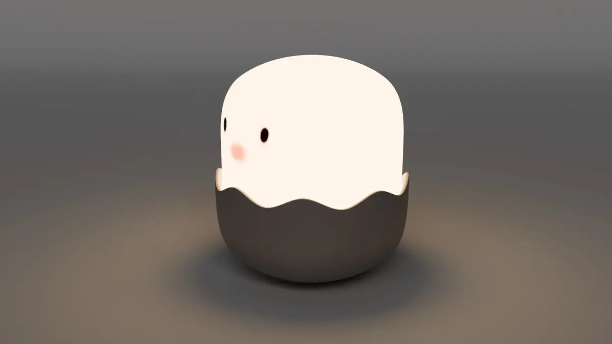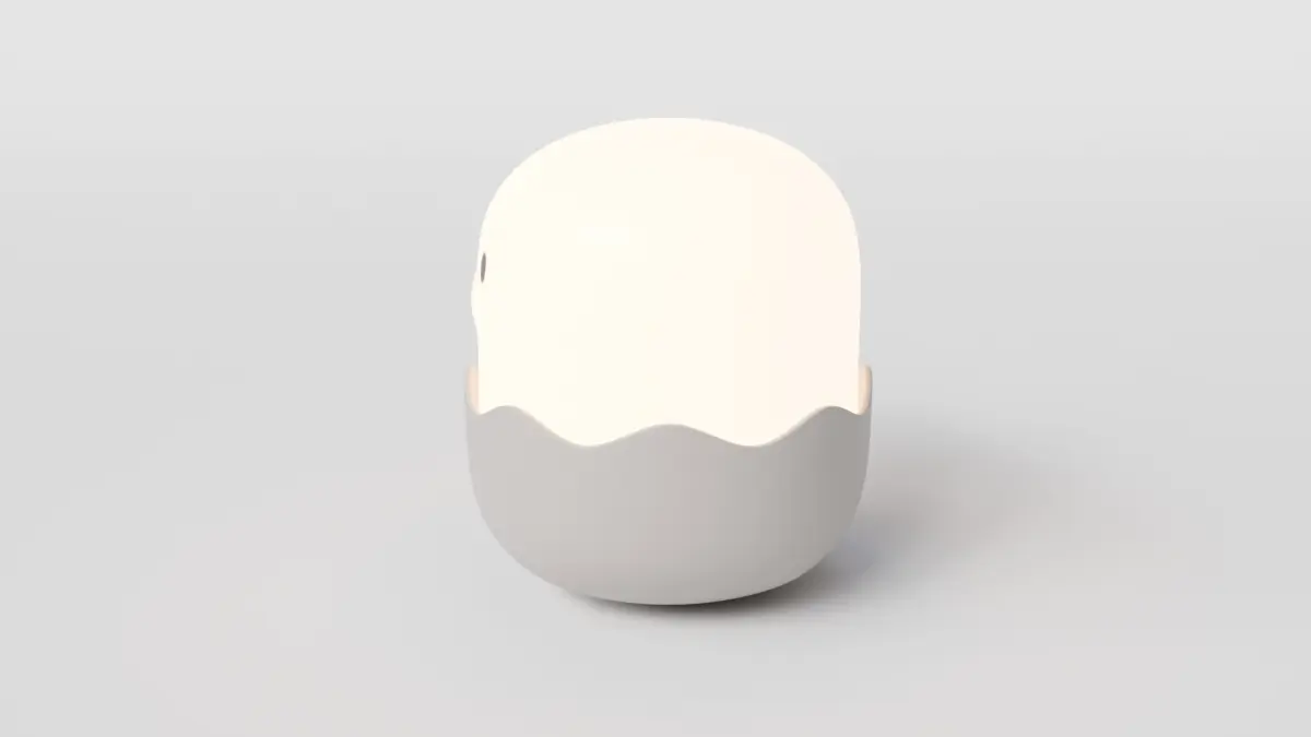 A charming and playful design featuring a cracked egg shell with a glowing inner light and a cute chick head popping out—ideal for cozy room scenes, stylized environments, or product visualization.