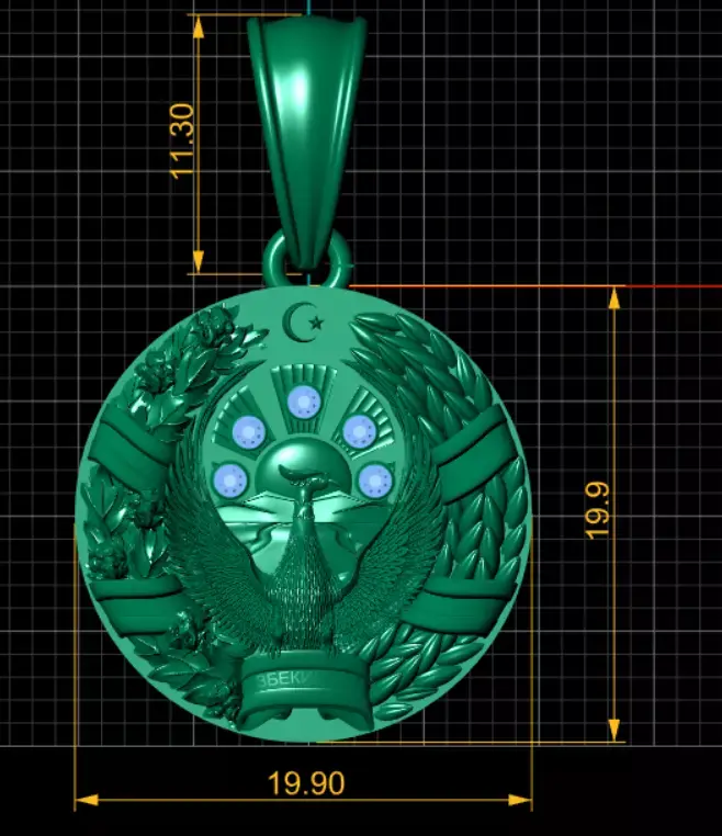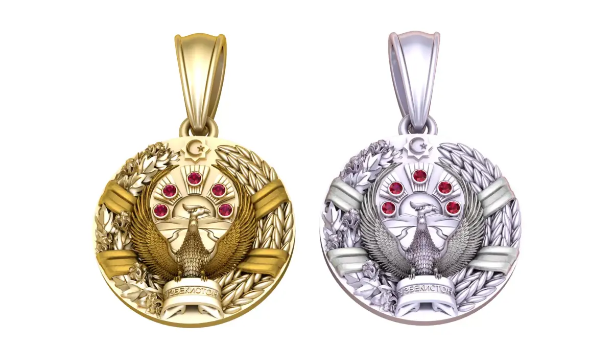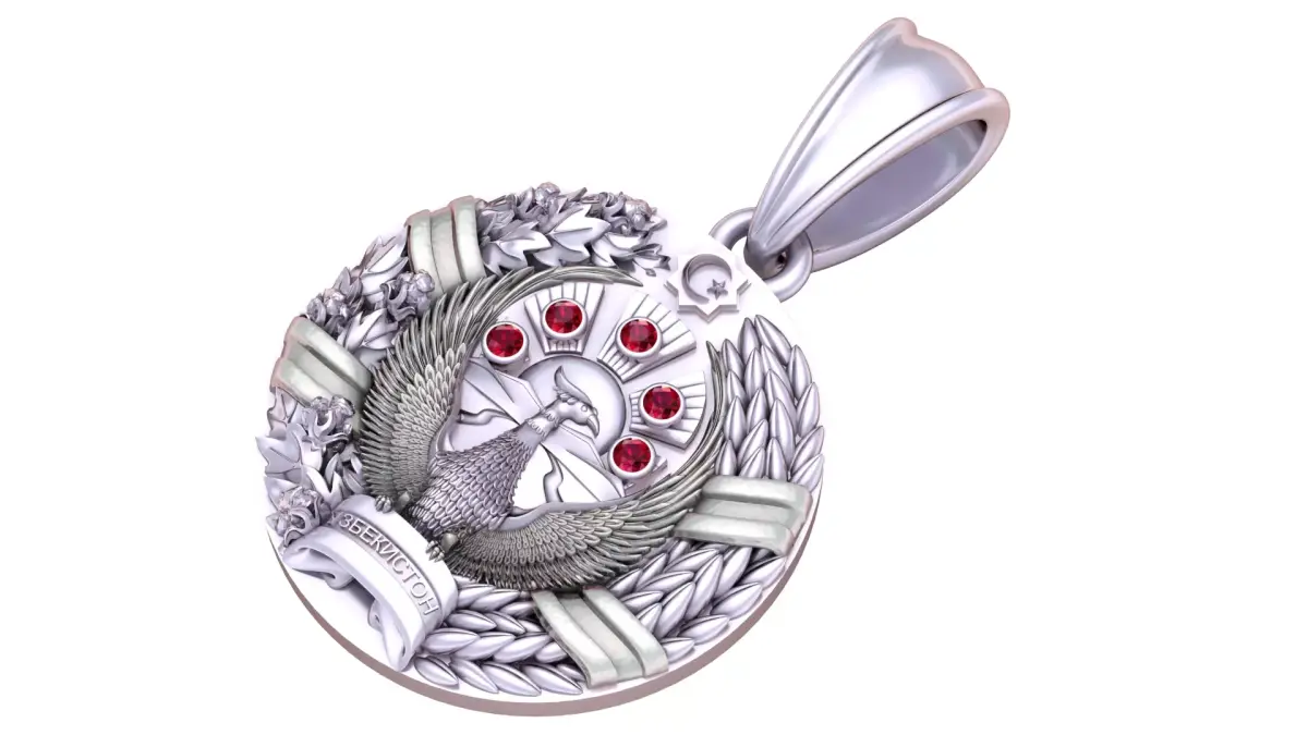 This exquisite gold Uzbekistan emblem pendant is a masterpiece of national pride and craftsmanship. Meticulously detailed, it features the mythical Khumo bird with wings spread wide, symbolizing freedom and strength, surrounded by wheat and cotton wreaths representing prosperity and abundance. At the top, the crescent and star embody heritage and faith, while the radiant sun motif is adorned with sparkling red gemstones, adding elegance and brilliance. The banner engraved with “Uzbekiston” anchors the design with cultural significance. This pendant is a perfect blend of luxury, symbolism, and patriotism, making it an ideal keepsake for collectors, a meaningful gift, or a proud emblem to wear close to the heart.