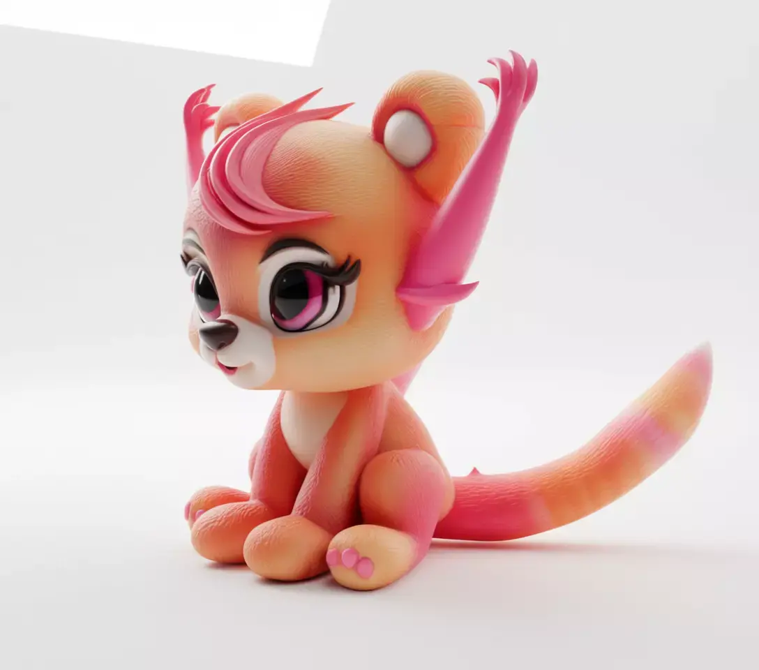 Download the enchanting 3D model of a cute orange fox, a digital recreation of a whimsical, stylized feline character designed to capture hearts and imaginations. This orange fox 3D model features a plump, rounded body covered in soft, fluffy orange fur — meticulously modeled to mimic real plush fabric with fine strand detail, natural clumping, and subtle highlights that enhance its tactile appeal. Its face is adorned with oversized, expressive black eyes framed by long, detailed lashes and delicate white accents — giving it an innocent, soulful expression. The nose is a tiny, rounded black button, while the mouth displays a gentle, closed smile. Its most striking feature is its large, upright ears — lined with lighter pink inner surfaces and topped with tufts of vibrant red-orange hair that sweep backward like a stylish mohawk. The tail is long and bushy, striped in alternating bands of orange and pale pink, curling gently behind it. Small, rounded paws with light pink paw pads complete its sweet, child-friendly aesthetic.