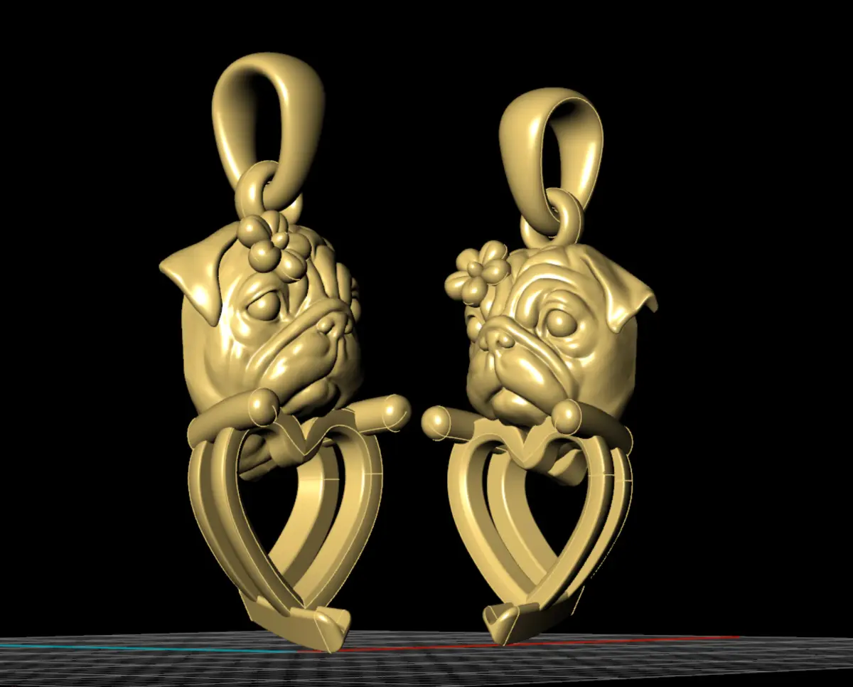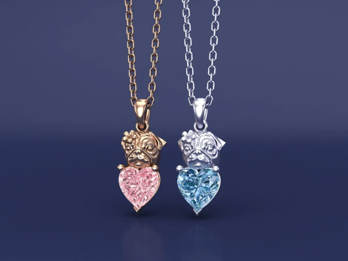 The pug design adds a whimsical and personalized touch to the necklaces, appealing to animal lovers or those who enjoy quirky jewelry.Below the pug's face, a large, heart-shaped gemstone is prominently displayed.The left necklace features a pink gemstone, while the right necklace features a blue gemstone. Both stones are faceted to catch and reflect light, adding brilliance to the design.The gemstones are securely held in place by prong settings, ensuring durability and st