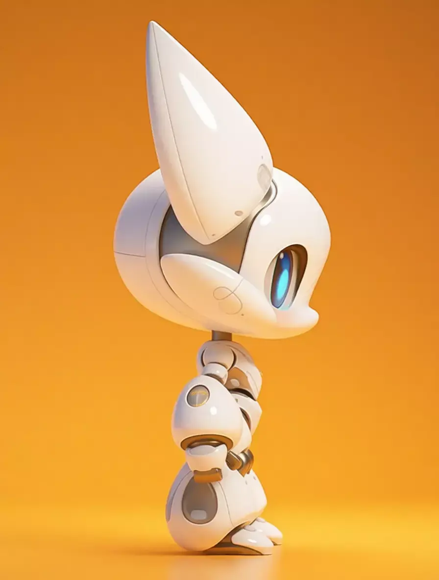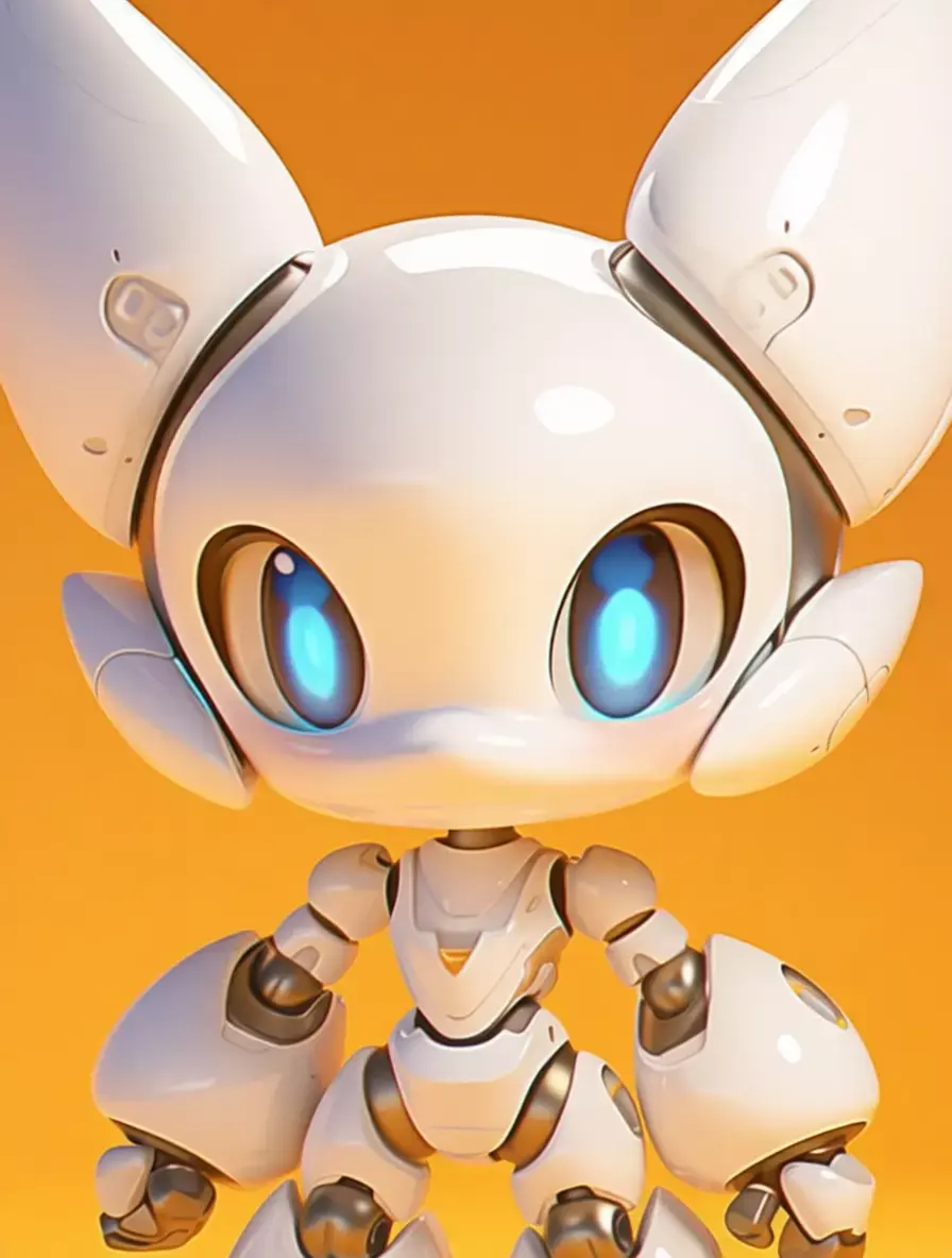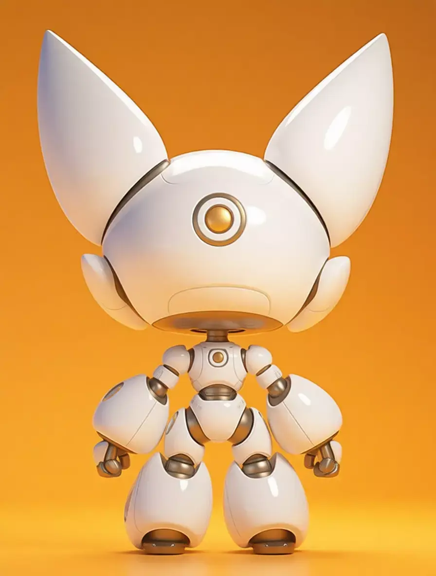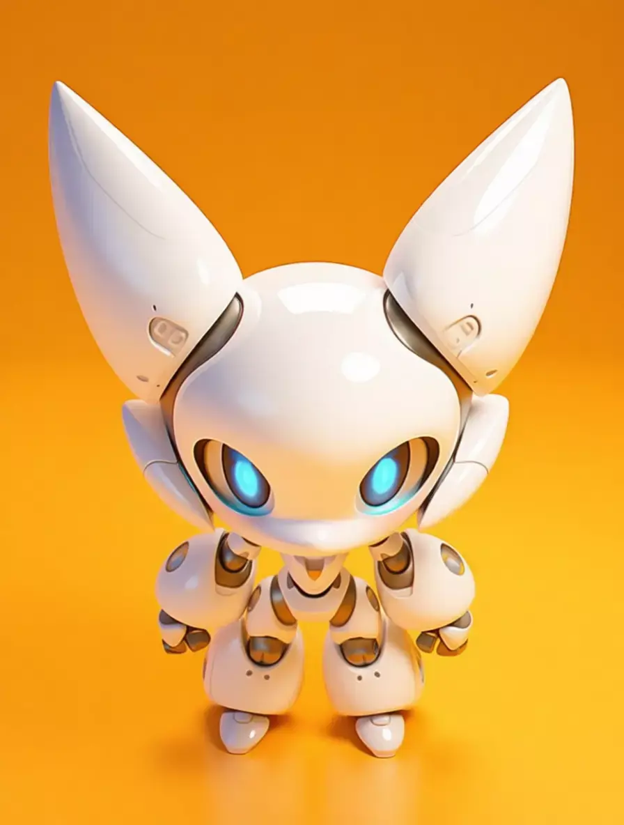 This is not merely a digital model; it is a meticulously crafted, hyper-realistic 3D asset that embodies the perfect fusion of advanced robotics, endearing character design, and cutting-edge visual artistry, presented against a warm, vibrant orange background that serves to accentuate its pristine white form and create a sense of cheerful, welcoming energy, making it an ideal centerpiece for any creative project requiring a symbol of friendly technology, futuristic companionship, or the gentle side of artificial intelligence. The robot itself is a charming, anthropomorphic feline figure, designed with an exaggerated chibi or kawaii aesthetic that emphasizes its large, expressive eyes and small, rounded proportions, evoking an immediate sense of warmth, affection, and innocence. Its primary body is constructed from smooth, glossy white panels that resemble polished ceramic or high-grade plastic, reflecting the ambient light with soft, luminous highlights that give it a clean, almost ethereal quality. This pristine white is contrasted elegantly with accents of brushed metallic silver on its joints, internal mechanisms, and the subtle detailing around its eyes and ears, adding a touch of technological sophistication without detracting from its overall cuteness. The most immediately arresting feature is its pair of enormous, round eyes, which are rendered with astonishing realism, featuring deep, glowing blue irises that seem to radiate a soft, inner light, suggesting advanced optical sensors or perhaps even a sentient, emotional core. These eyes are framed by delicate, sculpted eyelids and a slightly upturned mouth, giving the robot a perpetually curious and endearing expression that invites interaction and engagement. The head is crowned with two large, pointed ears, also finished in glossy white, which are articulated at the base, allowing them to swivel and tilt independently, adding a layer of expressiveness and lifelike movement to the character. The body is compact and sturdy, with a clearly defined torso, arms, and legs, all connected by highly articulated joints that are visible as exposed, metallic components, hinting at the complex engineering required to achieve such fluid, natural-looking motion. The arms and legs terminate in simple, rounded hands and feet, designed for stability and interaction rather than complex manipulation. The entire robot is positioned in a neutral, standing pose, facing directly towards the viewer, which creates a strong sense of connection and intimacy, as if it is waiting to be greeted or played with. The lighting is expertly controlled, casting soft, diffused shadows beneath the robot that provide a sense of weight and presence on the surface, while the specular highlights on its glossy surfaces are perfectly rendered to mimic the reflection of a real-world environment, enhancing the perception of its premium materials and flawless finish. This level of photorealism makes the asset indistinguishable from a high-end product photograph, offering unparalleled flexibility for designers, marketers, and content creators seeking to convey a message of friendliness, innovation, and the positive potential of human-robot interaction. It is a powerful visual metaphor for the future of personal robotics, where machines are not cold, impersonal tools but warm, engaging companions that can provide comfort, entertainment, and assistance in our daily lives. Whether used in advertising campaigns for consumer electronics, promotional materials for AI startups, editorial content about the ethics of robotics, video game assets for family-friendly titles, or architectural visualizations of smart homes, this robotic cat stands as a testament to human creativity and the enduring desire to create technology that is not only intelligent but also emotionally resonant. Its design is not just about function; it is a statement of empathy, a declaration that the future of technology can be gentle, kind, and filled with wonder, all wrapped in a package of undeniable charm and appeal. The sheer quality of the rendering, from the subtle reflections in the paint to the precise detailing of the seams and fasteners, speaks to the immense skill and dedication of the artist who created it, making it a valuable asset for any project that demands the highest standards of visual excellence and emotional impact. The image evokes a profound sense of joy and curiosity, inviting viewers to imagine a world where such companions are commonplace, providing solace to the lonely, amusement to children, and a tangible link between humanity and the machines we create. It is a vision of a future that is not only technologically advanced but also deeply humane, a future where the boundaries between organic and synthetic blur in the most delightful and heartwarming of ways.