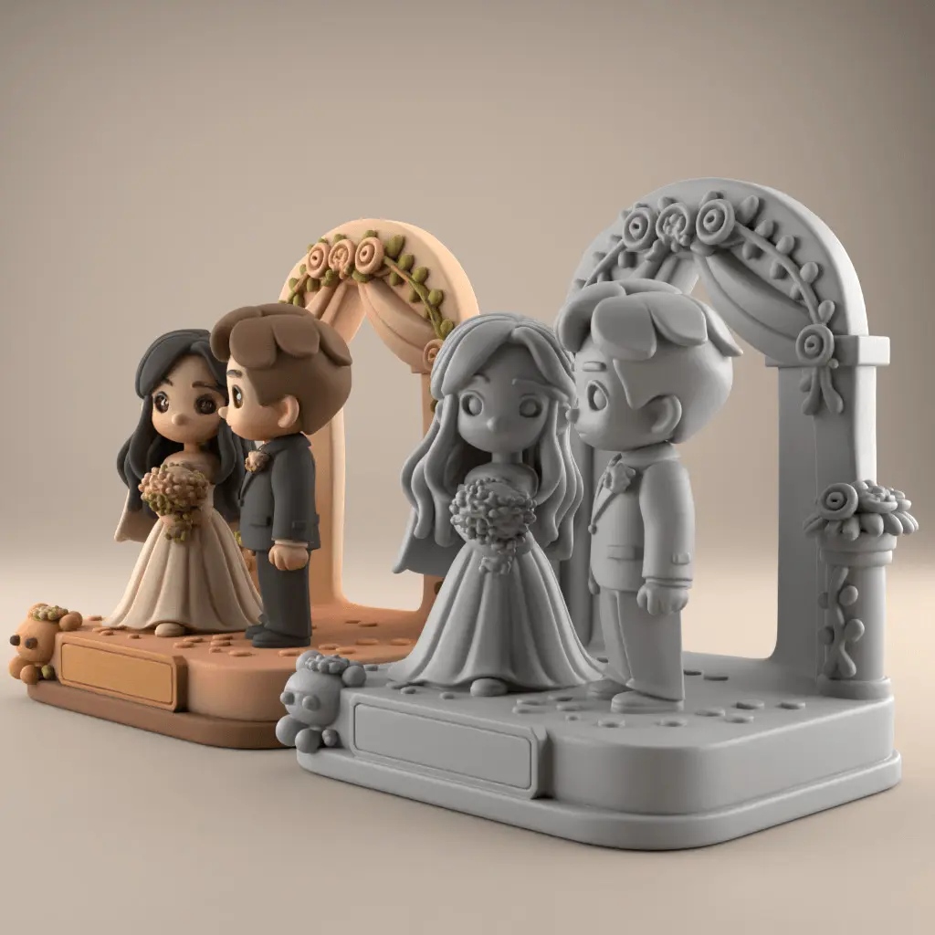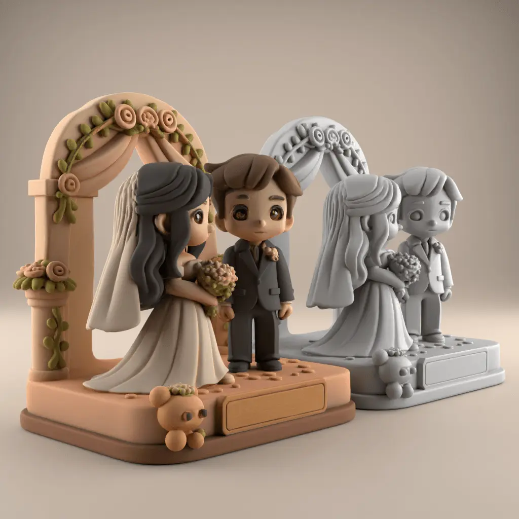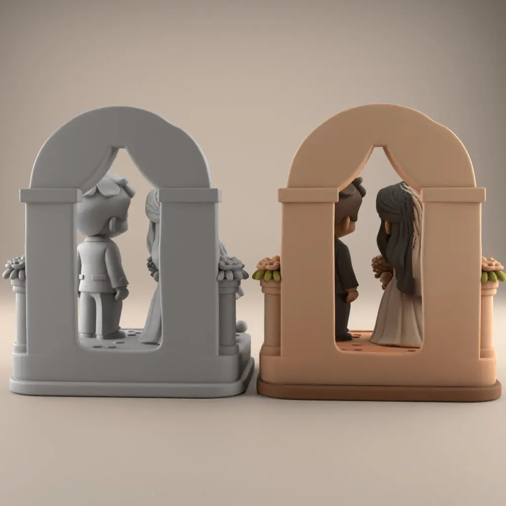Design ConceptThis model features an adorable wedding couple standing under an ornate arch, with intricate details such as small floral arrangements and loving expressions. It's an ideal representation for a decorative piece or a cake topper for weddings.