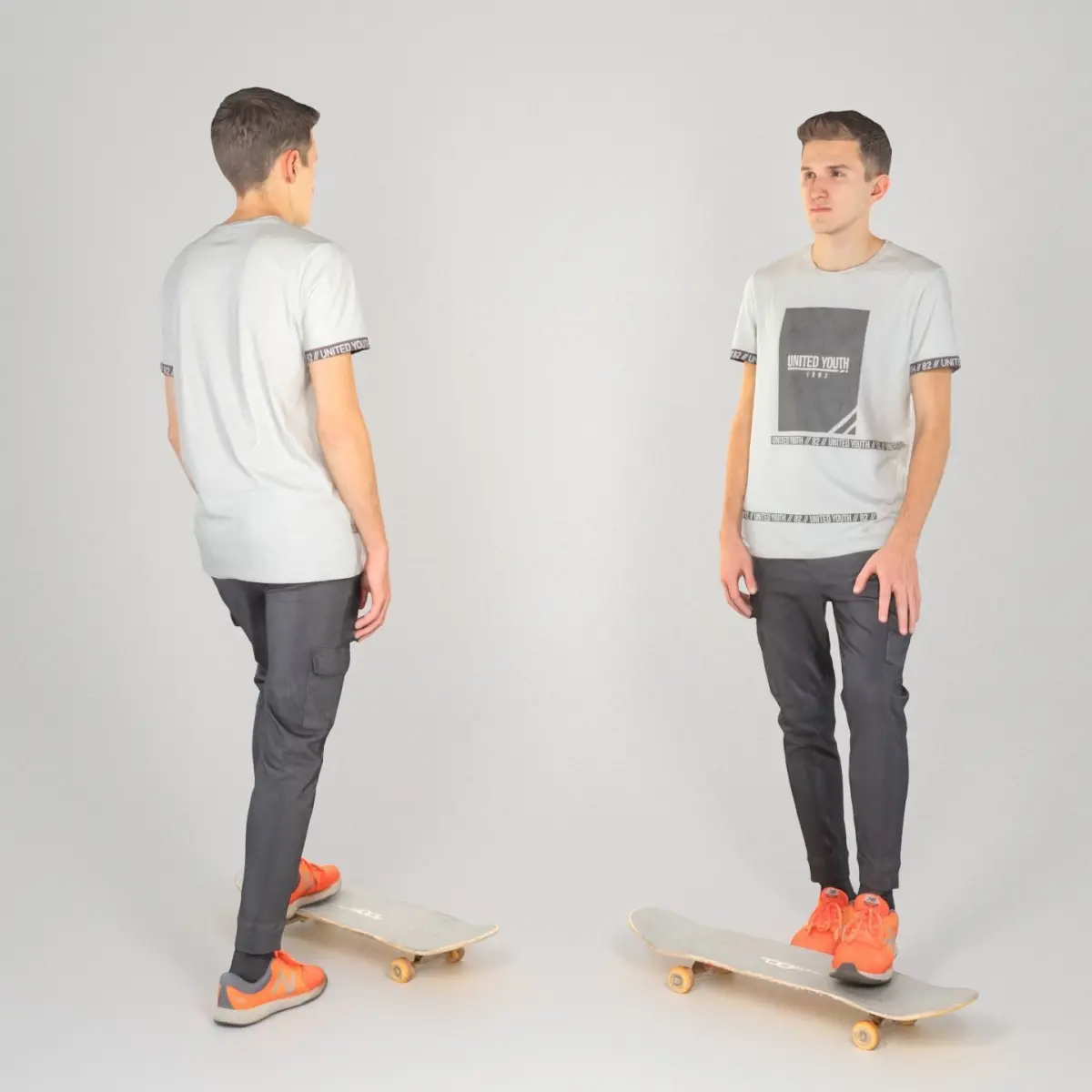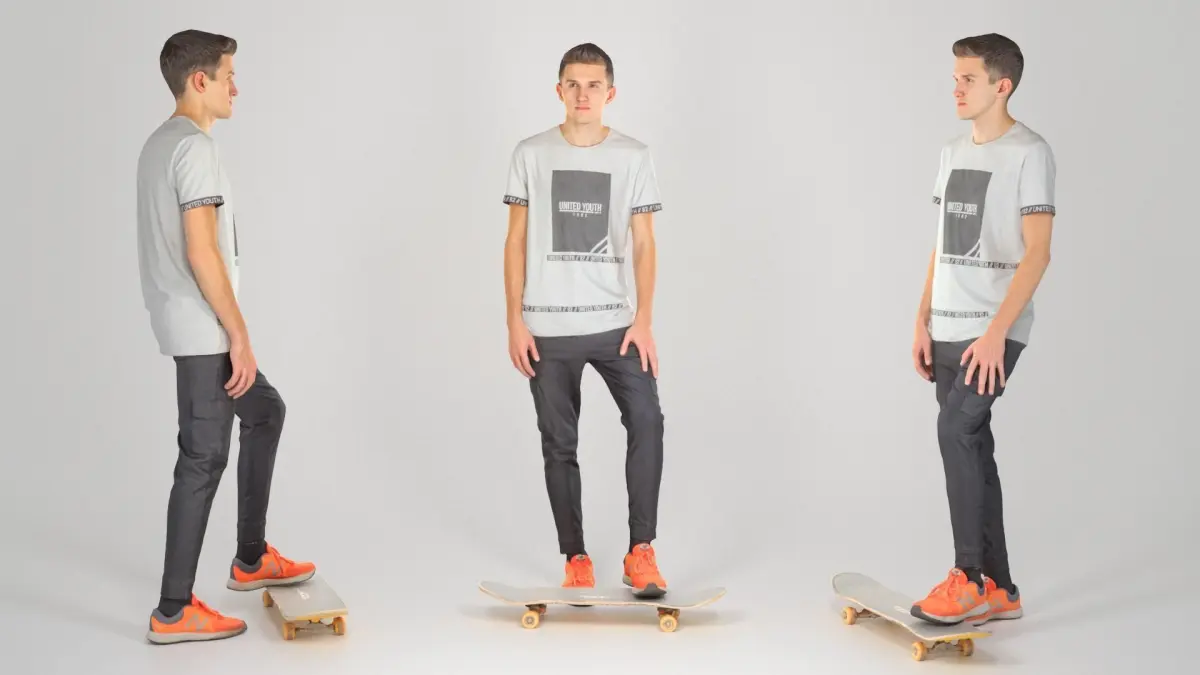 This is a true human size and detailed model of a sporty handsome young man riding a skate. The model is captured in tipical riding pose to be perfectly matching for variety of architectural visualizations, e.g. sport ground, gym, beach, etc.