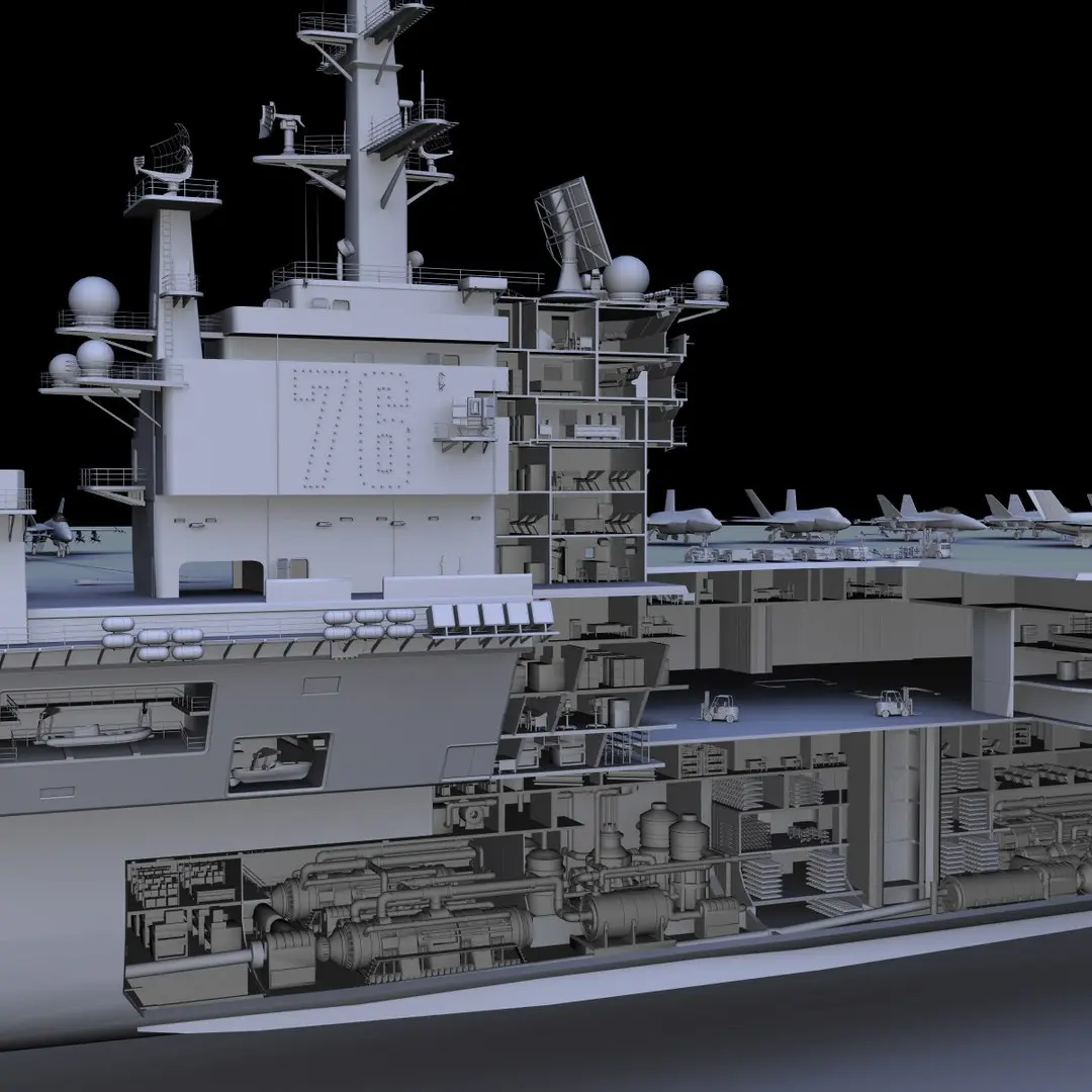The USS Reagan 3D model complete with internal decks and cutaway was produced for the Virginia Air and Space Center and Popular Mechanics Magazine. It is a highly detailed model of the exterior and interior of a Nimitz class aircraft carrier from deck plans. The ship itself, was undergoing its 'Tiger Cruise' and the images created were printed in Popular Mechanics and a 21 foot long version is on display at The Virginia Air and Space Center. A version was also printed in Maxim Magazine. The model here, is the model used to produce that cutaway work.
