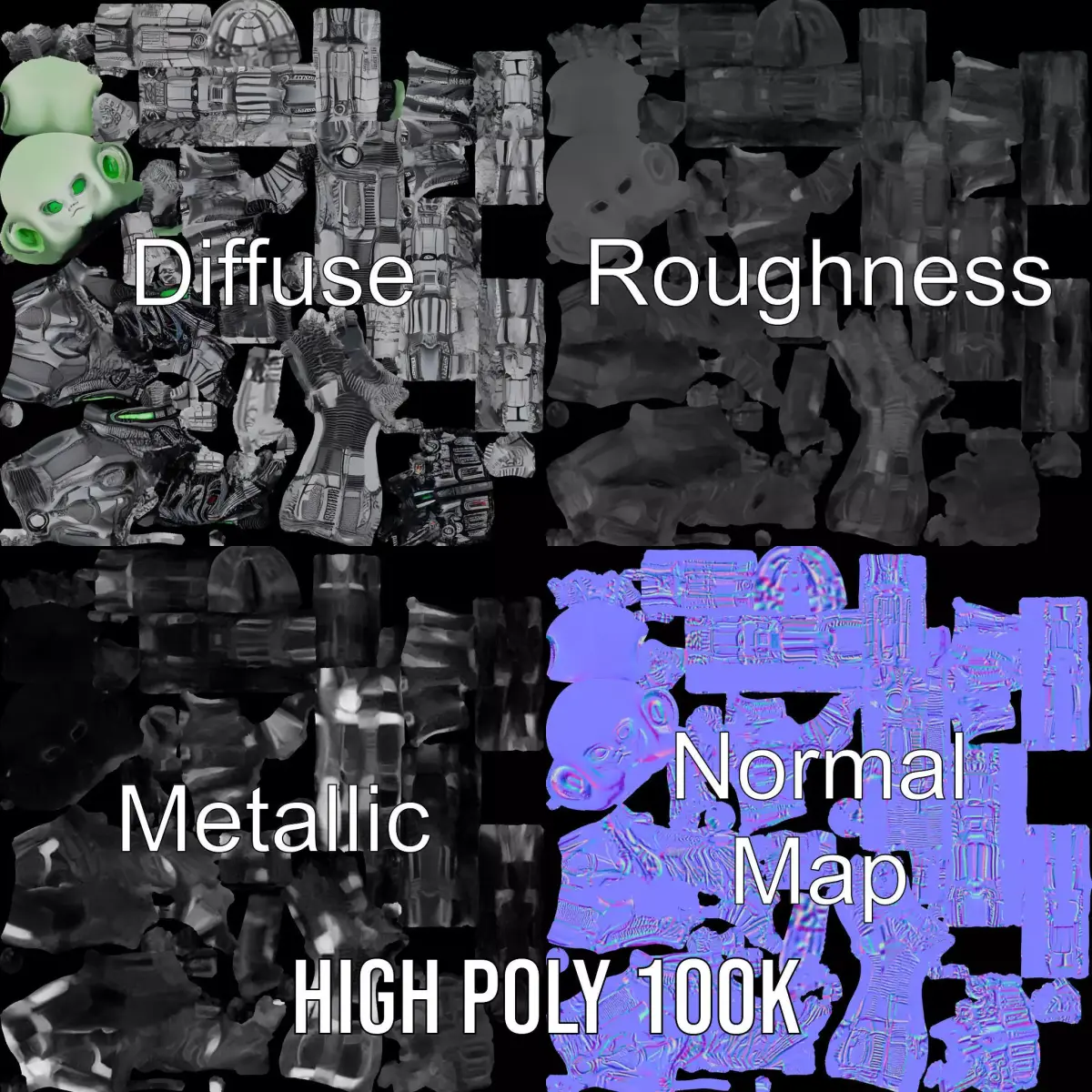 This Cyber Alien Warrior model pack is designed to captivate with its futuristic and robotic design. Perfect for sci-fi films, games, and VR experiences, it stands out with its intricate details and menacing appearance. Each model has 3 levels of detail: low-poly (1000 triangles for mobile), middle-poly (10,000 triangles for environment), and high-poly (100,000 triangles), which allows for the use of this model in production rendering (such as 3ds Max, Maya, Cinema 4D, Blender, Vray/Corona/Cycles, and all others), game engines (Unity and Unreal compatible), and interactive presentations, providing a choice of detail based on the LOD System principle. The model's textures are PBR, Diffuse, NormalMap, and reflection/roughness/metallic, suitable for any modern rendering engine. All models are accurately unwrapped and have no overlapping UVs. All textures are 4096x4096 in size. If you like this model, please leave a comment and a like!