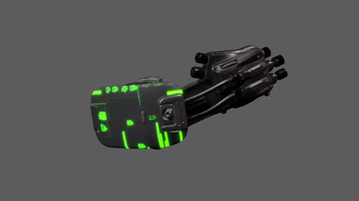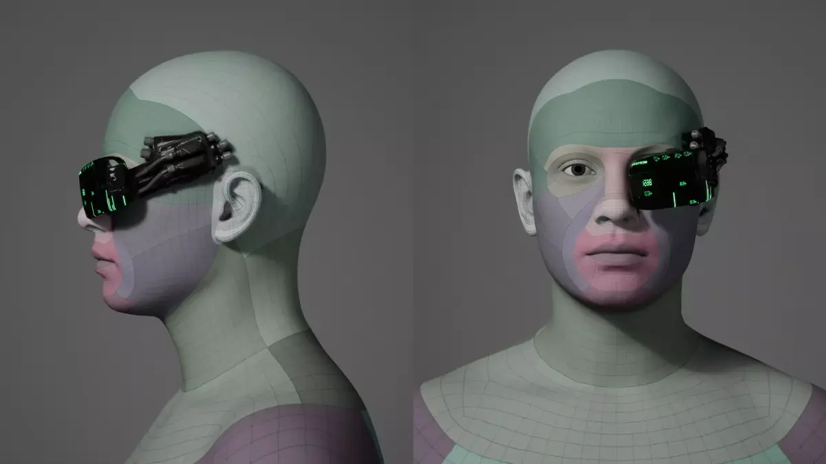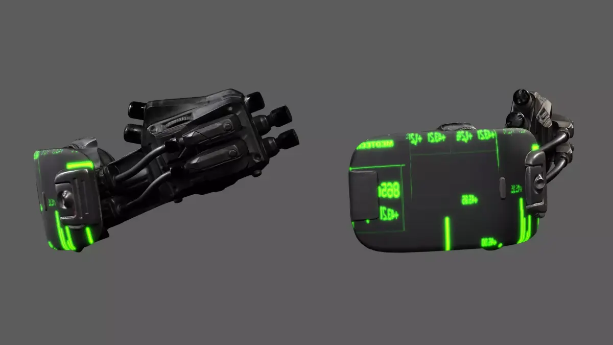 Enhance your character's tactical realism with this futuristic cybernetic eye scanner, a wearable HUD device mounted directly over the face. Designed with a glowing green interface, high-tech cabling, mechanical housing, and a holographic display, this device is perfect for cyberpunk operatives, military engineers, or dystopian survivors.