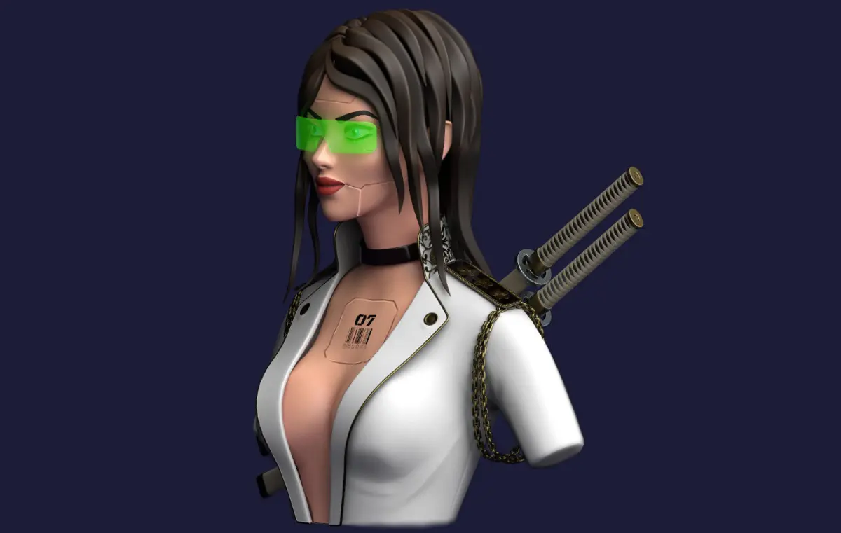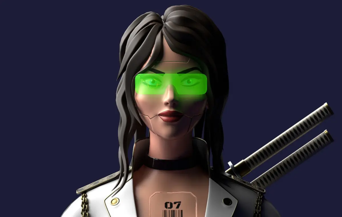 Ringtail Studio presents a game-ready, low-poly model of a Cyber Girl - a brunette with green sunglasses on, a white shirt, and two swords behind her back.