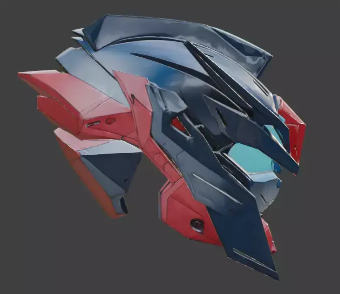This is a high-quality 3D model of a cyber-mecha guardian helmet, featuring an aggressive, angular design inspired by classic mecha and futuristic robotic aesthetics. The asset is finished in a navy-blue and crimson-red armored shell, representing a hero-tier piece of gear for giant robots, futuristic knights, or high-tech armored suits. It is designed with professional-grade geometry and PBR (Physically Based Rendering) materials, showcasing a clean, high-gloss finish suitable for cinematic renders or character-driven action games.
