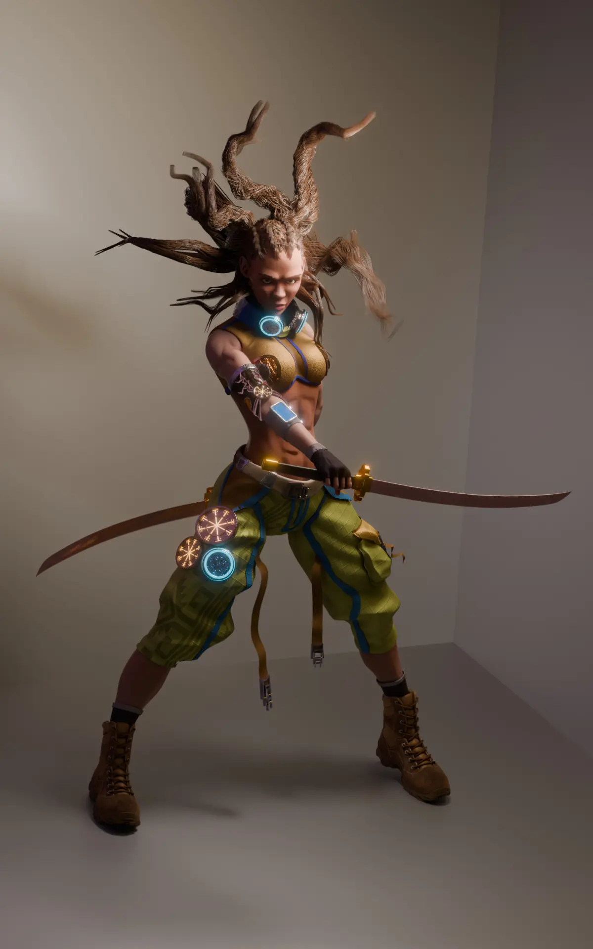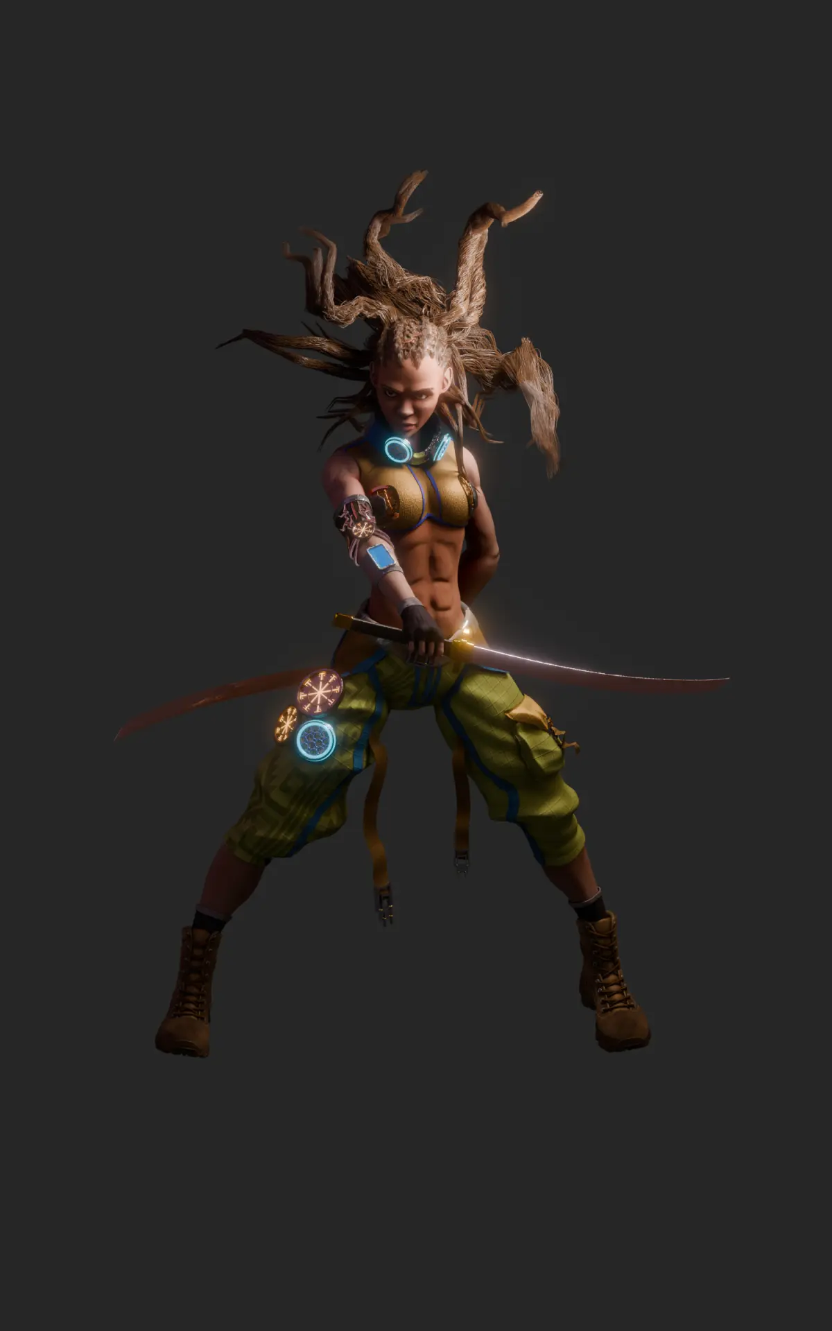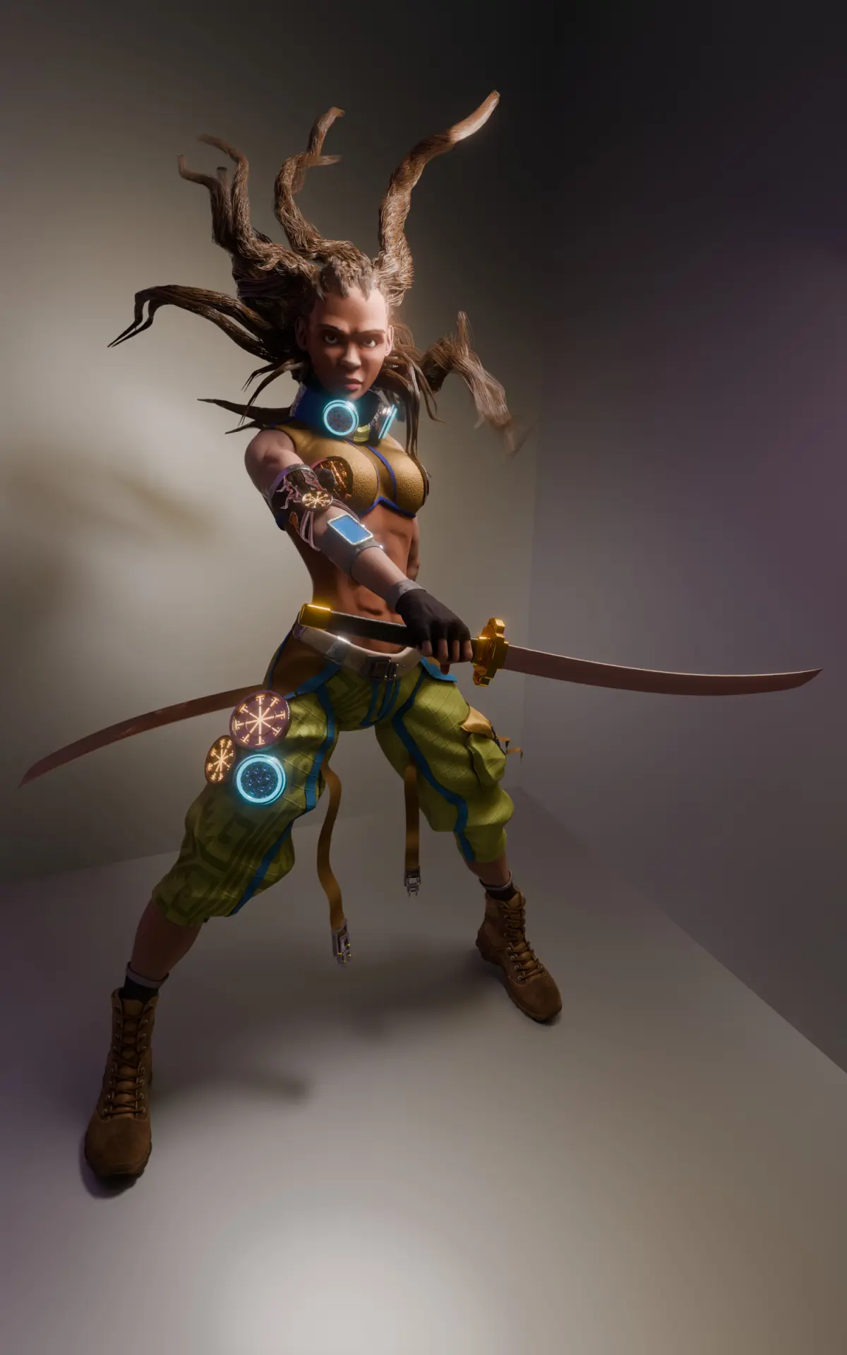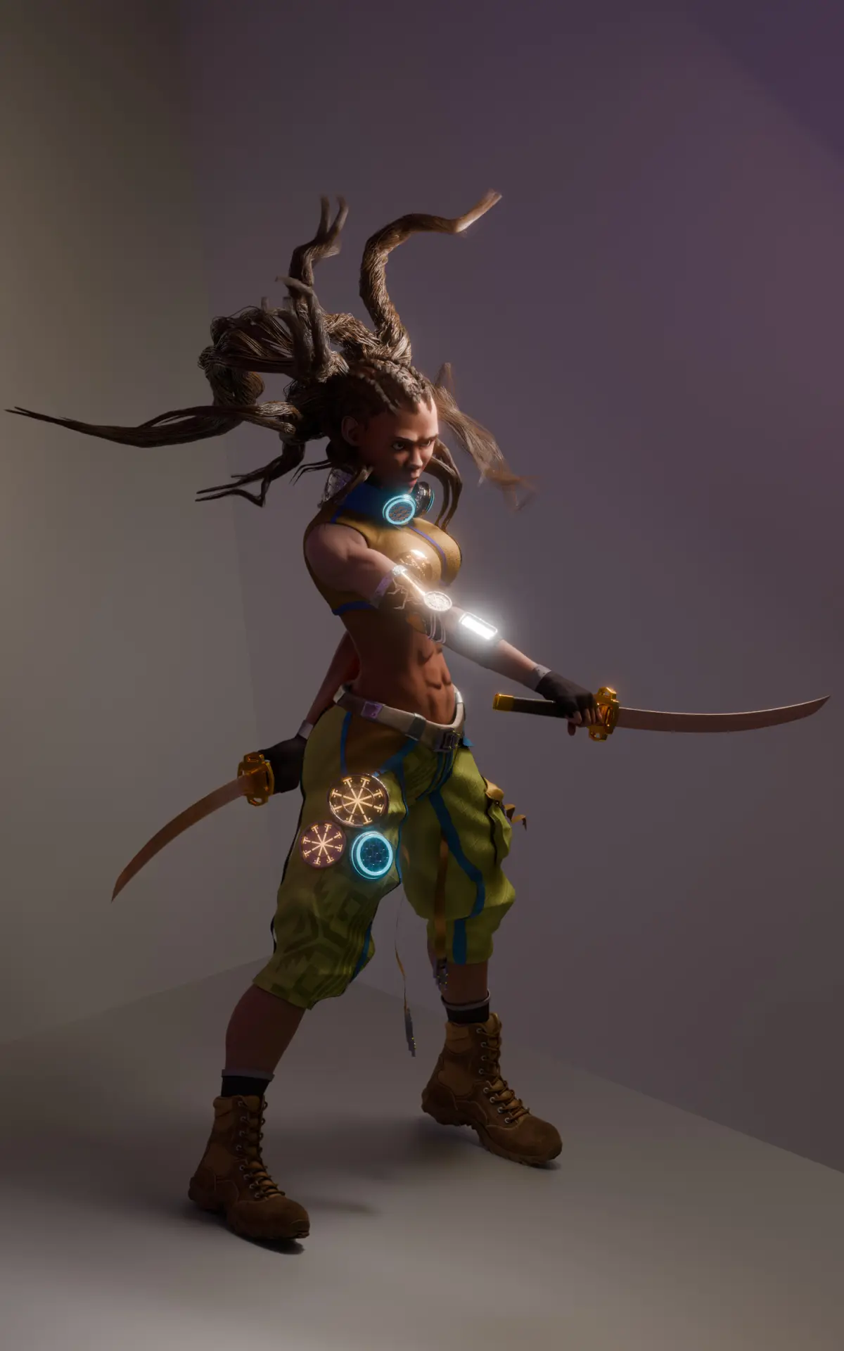 - Twin katana setup with tactical gear and glowing tech glyphs