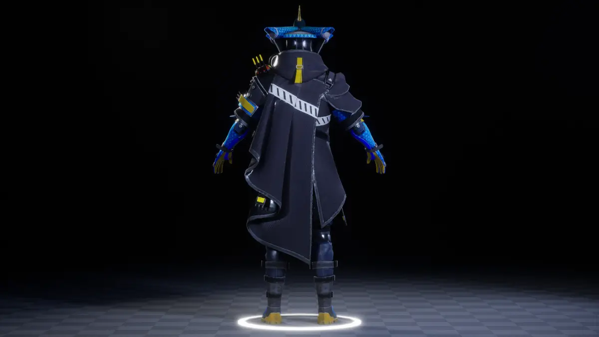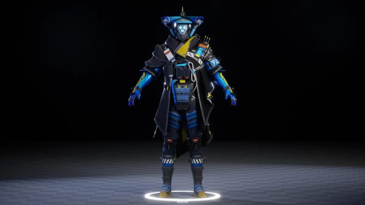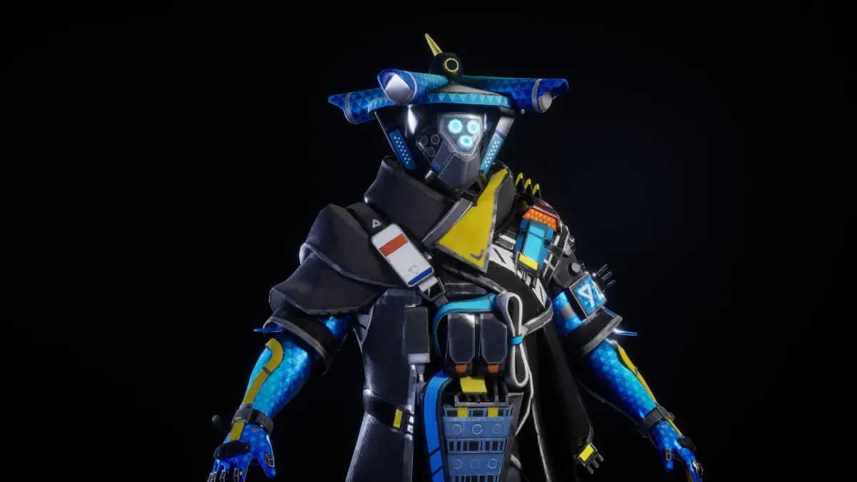 This is a 3D model of a futuristic cyber-ninja character designed with a high-tech, tactical aesthetic. The character wears an armored black and blue outfit infused with neon yellow and blue highlights, giving it a sleek, electric vibe. A unique hat resembling traditional Japanese headgear blends ancient warrior symbolism with advanced technology. The glowing digital face mask, along with robotic gloves and mechanical components across the arms and chest, amplifies the sci-fi theme. The character's body is outfitted with utility pouches, power cells, wires, and detailed armor plating, suggesting its role as a high-performance operative or digital mercenary.