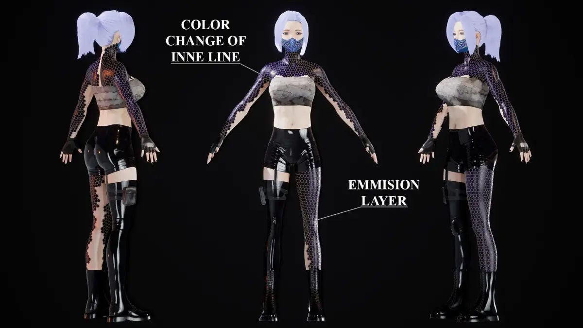 2 material skin(chrome/mettal), In body materials you can change main color of hexagons, add inner line color, emmision channel of hexagonsSwetnes control, and whole body roughness control.