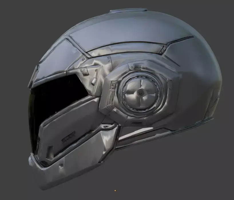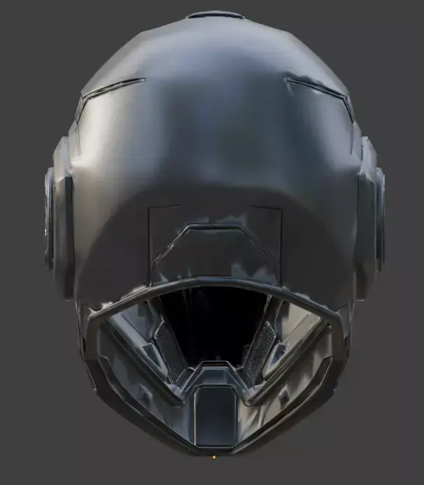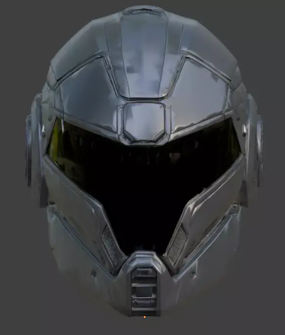 Realistic PBR Texturing: The materials exhibit high-fidelity light interaction, with a sharp contrast between the matte primary panels and the semi-reflective properties of the dark ocular visor.