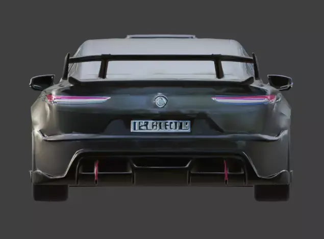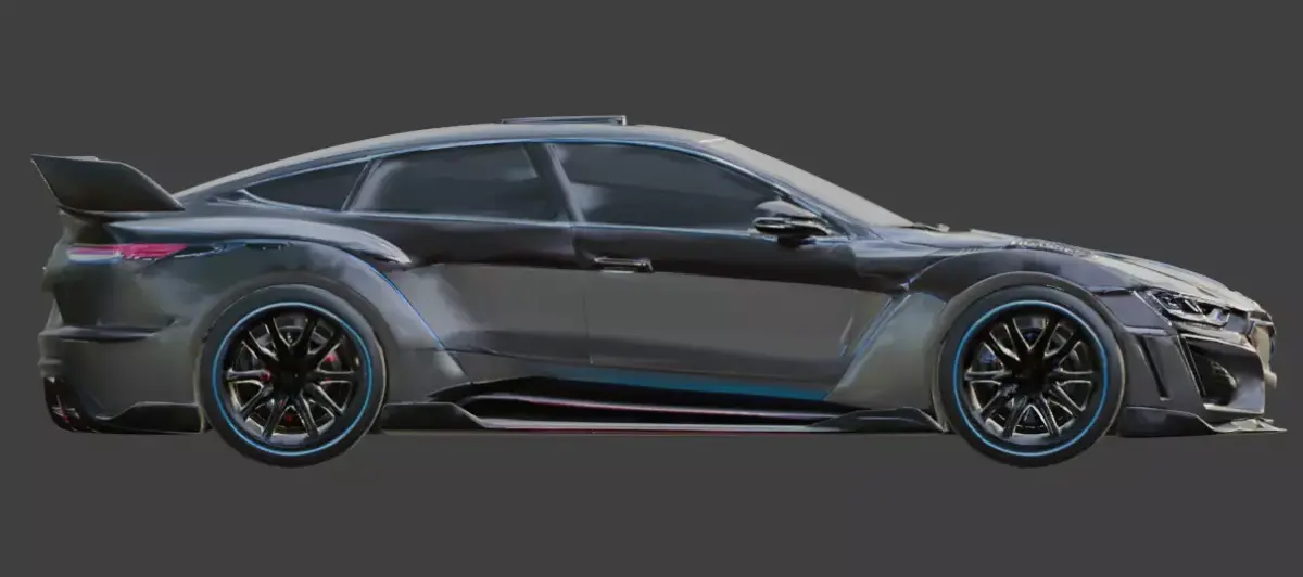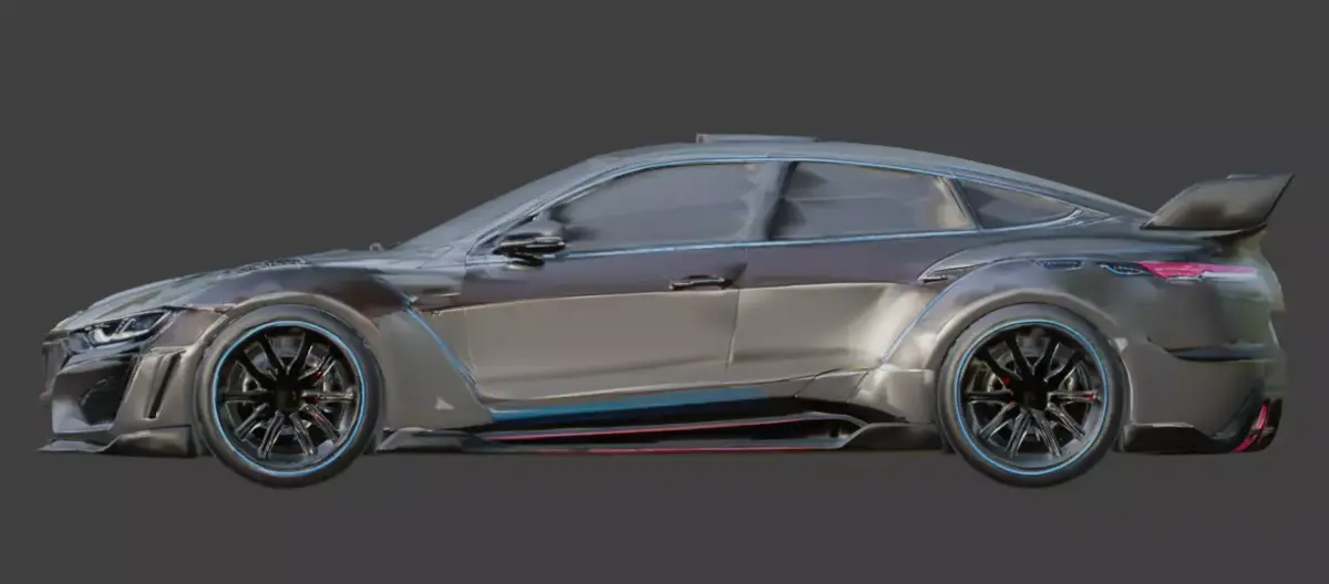 Tagssports sedan, tuned car, futuristic vehicle, 3D model, neon lighting, GT wing, aerodynamic kit, cyber aesthetic, high-fidelity, racing asset
