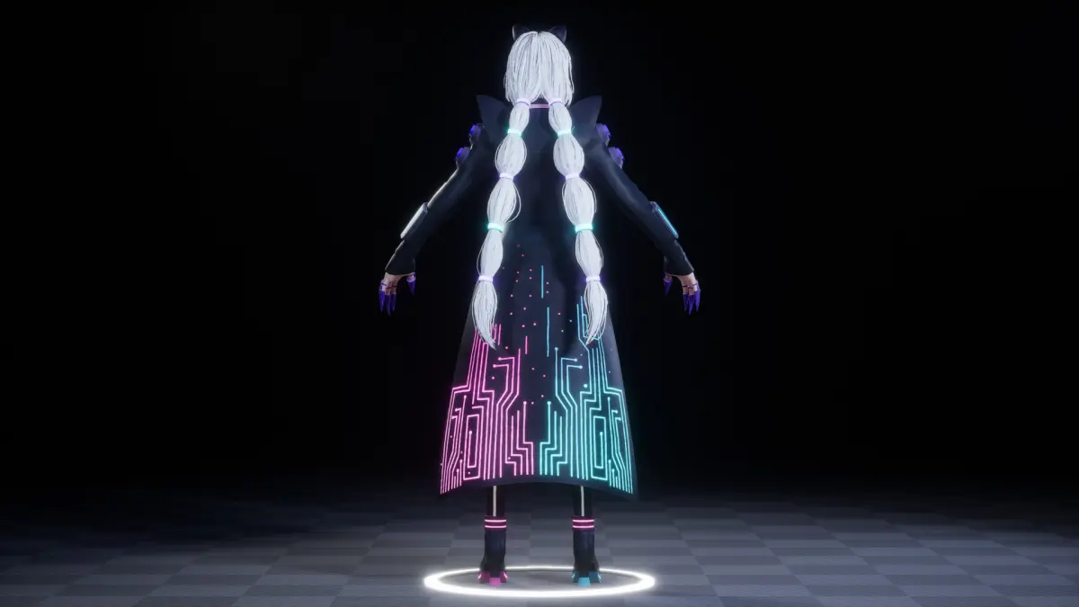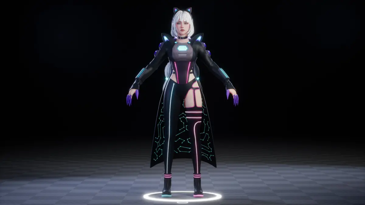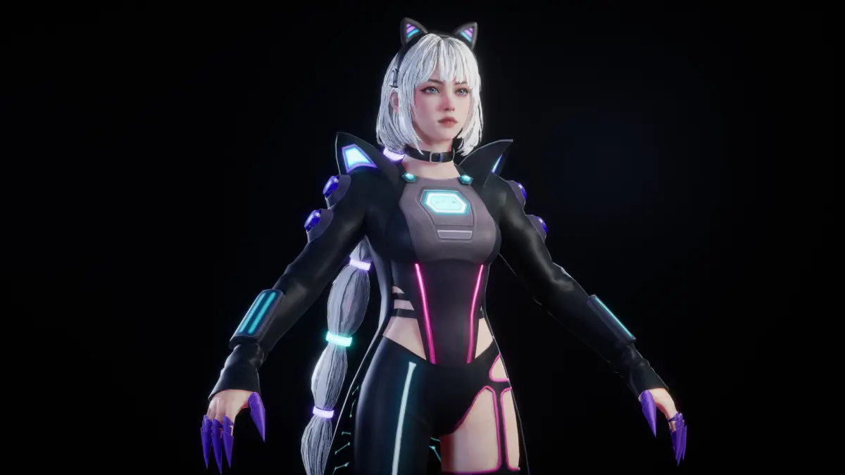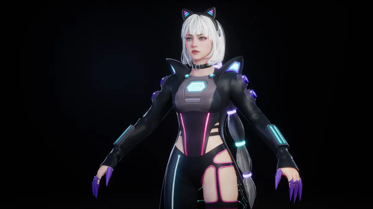 This is a 3D model of a futuristic cyberpunk assassin girl with a cat-inspired aesthetic, designed with high-tech details and vibrant neon accents. The character features a sleek black bodysuit with glowing circuitry patterns, sharp violet claws, and illuminated cat ears, giving her a fierce and stylish look. The outfit is detailed with a combination of smooth and armored textures, showcasing excellent craftsmanship perfect for sci-fi, action, or fantasy games and animations. The character's half-exposed leg design adds a bold edge to the costume, while her white hair and intense expression enhance her cybernetic persona. Optimized for rendering in software such as Blender, Maya, 3ds Max, and Unreal Engine, this model is ideal for cinematic scenes, VR experiences, and futuristic storytelling. The powerful combination of elegance and danger makes her an excellent addition to any creative project looking for a cyber-fantasy heroine.
