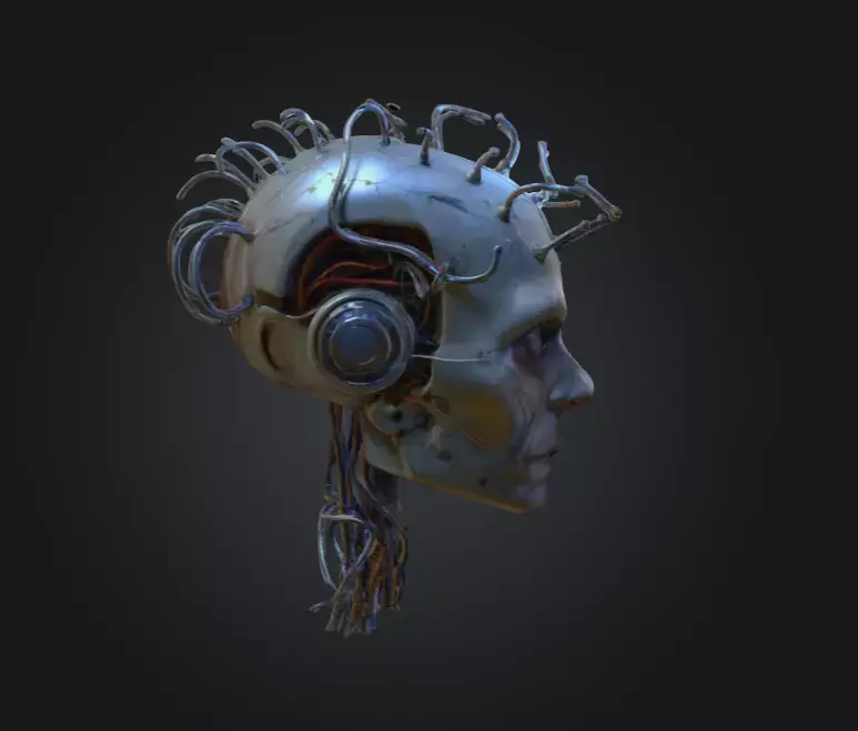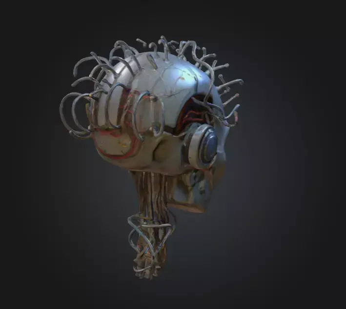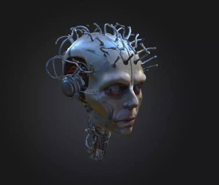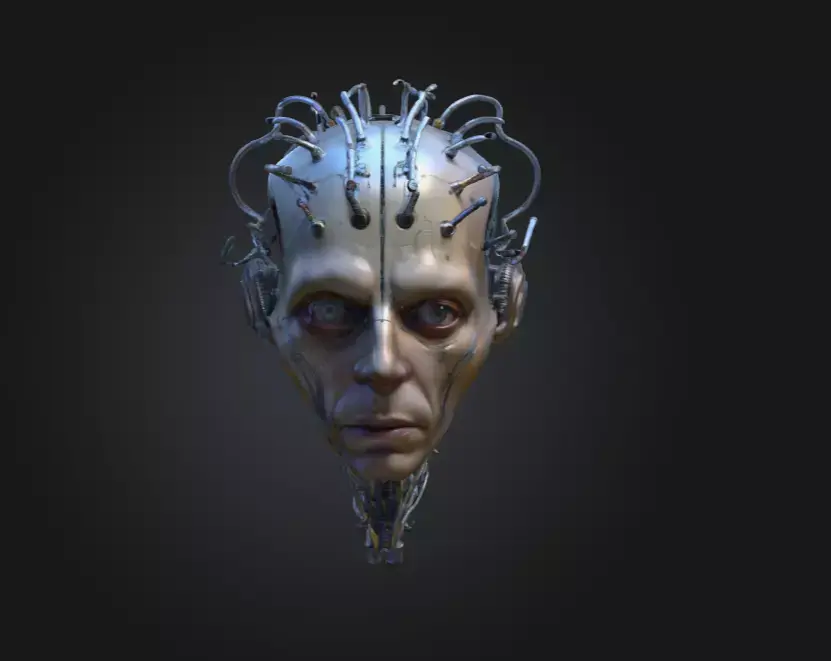 Every element has been crafted with careful attention to micro-detail: exposed wiring, embedded metal plates, neural ports, and mechanical implants enhance the model’s believability. The facial features retain a strong human foundation—lifelike skin folds, natural facial shapes, and expressive eye structures—while seamlessly integrating with the cybernetic architecture that surrounds the skull.